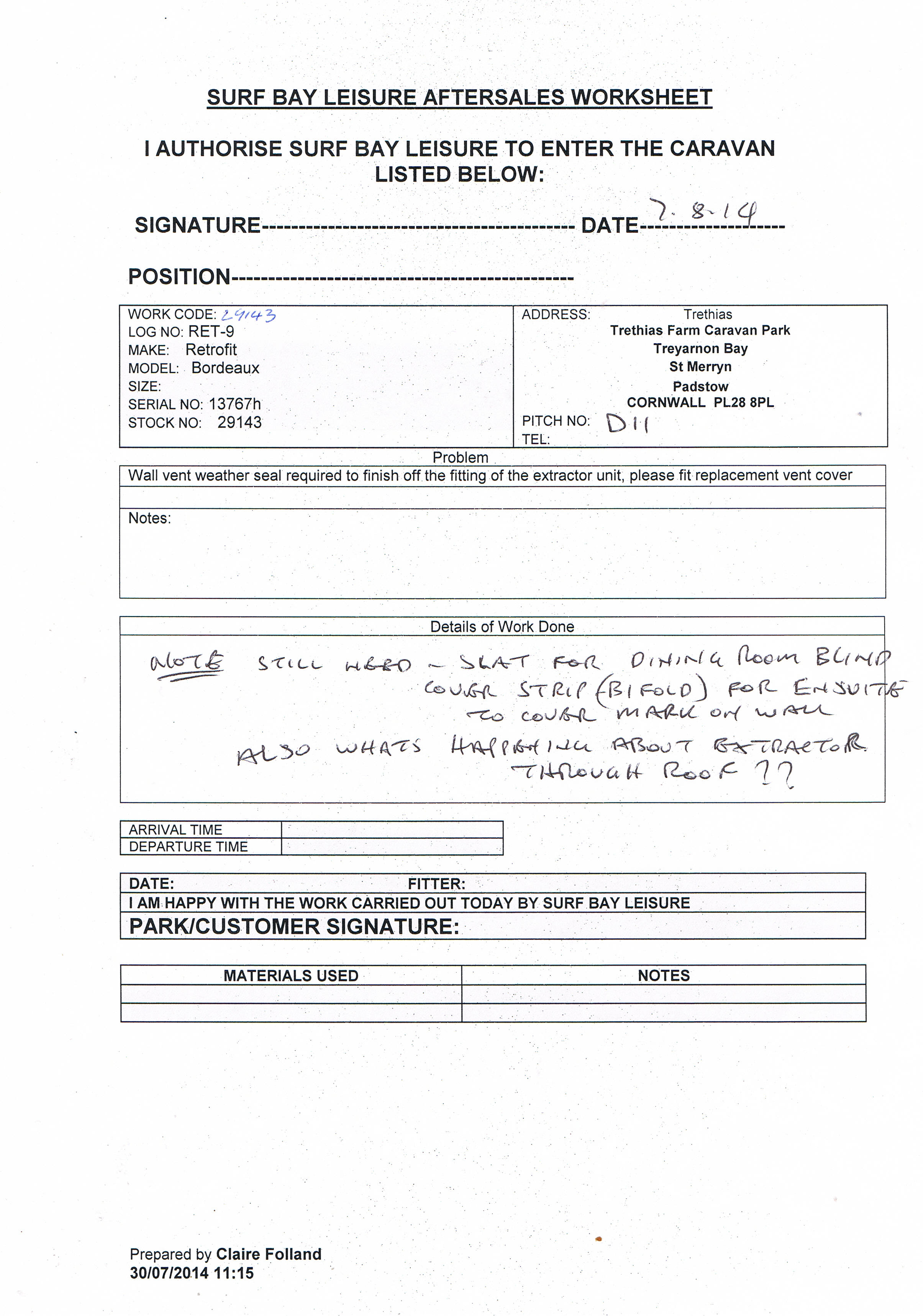 Lorraine Pryor (Inactive) added a comment - I have taken the work sheet off Maureen and said I will deal with this. I will close this one off and set up another one for the bi fold to finish this job off