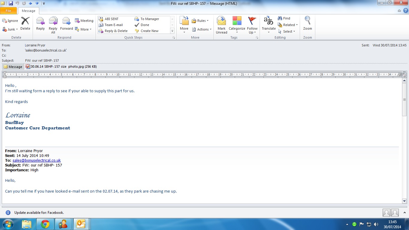 Lorraine Pryor (Inactive) added a comment - I have had a reply from Andy at Bonus to say he was looking into it. Then I have received another one to say" Apologies, I have wrapped and sent another cooker hood which is been sent asap on a next day to be with you Monday. We are looking into the original hood and what has happened; please accept my apologies on the delay. I have again send another email to Ron at Beachside.