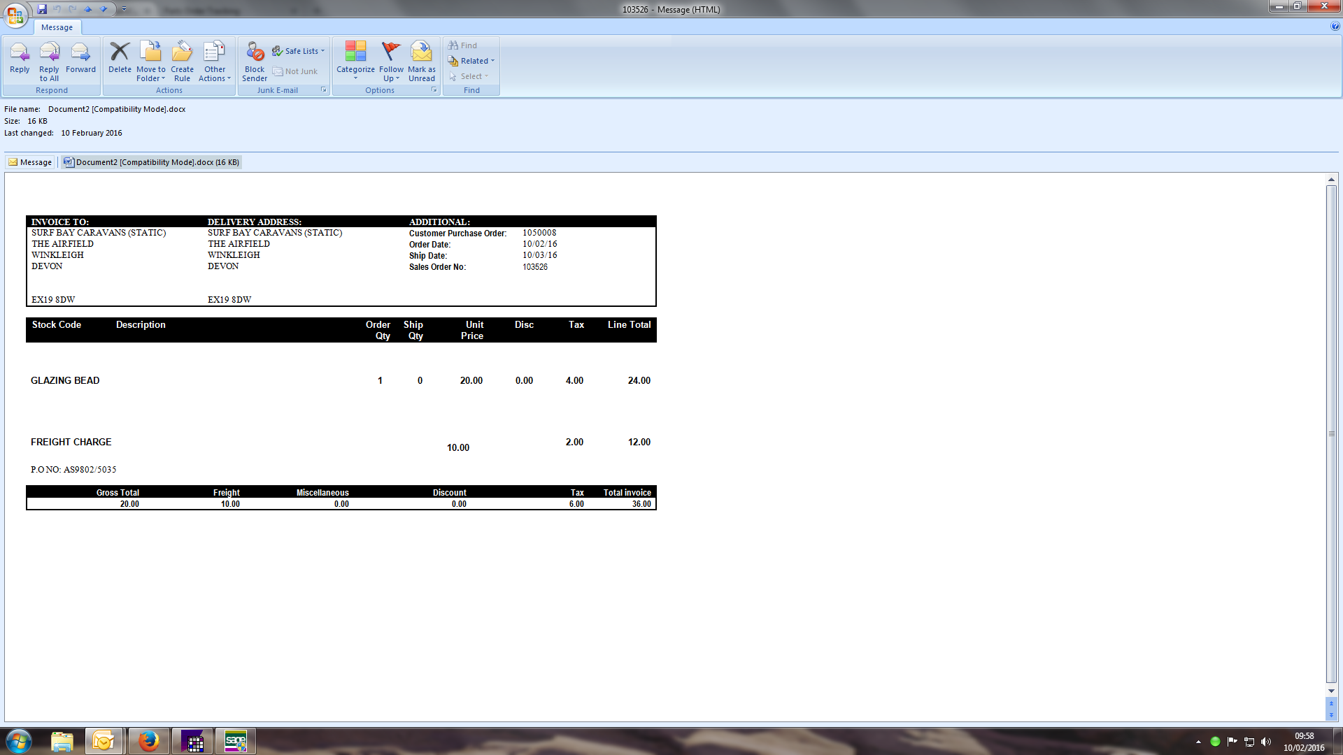 recieved glazing bead from ABI, issued worksheet, steve needs to check this before he goes to site