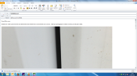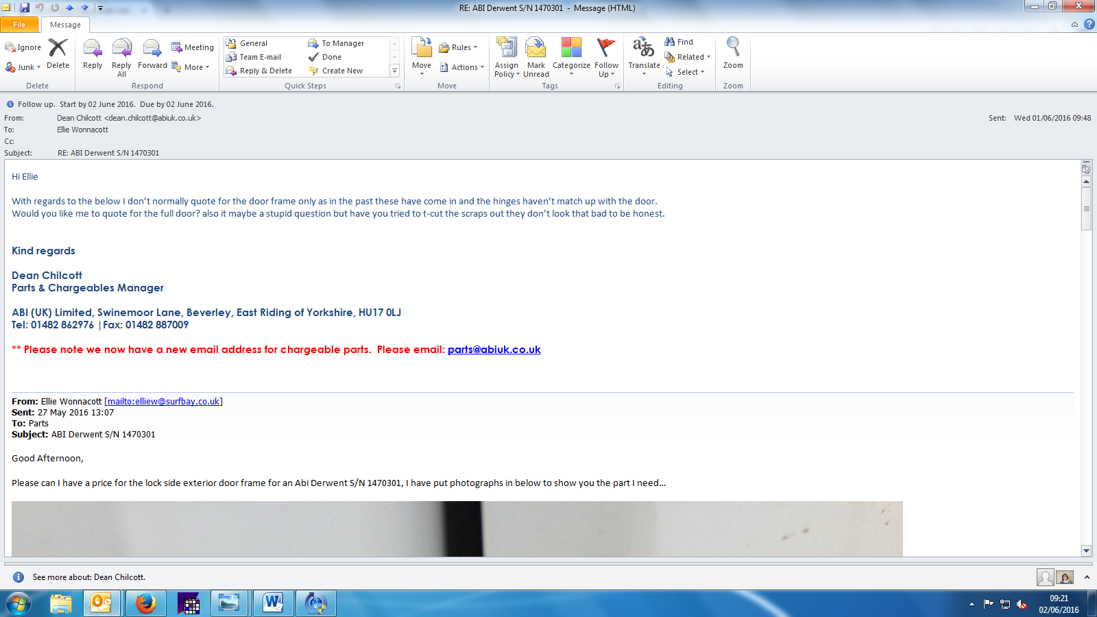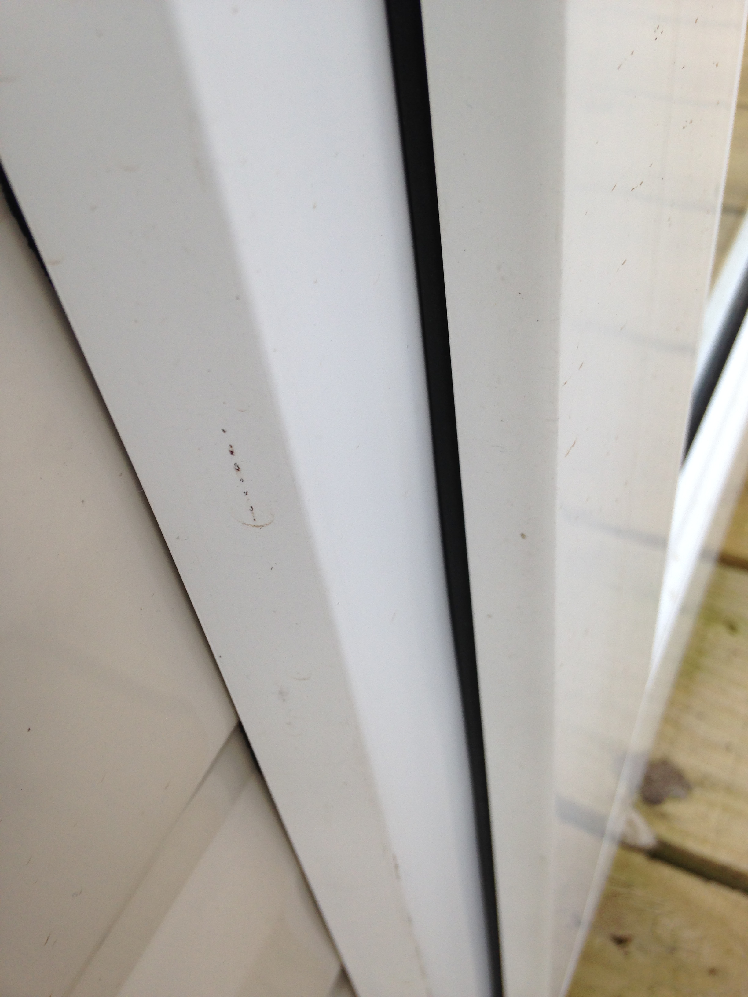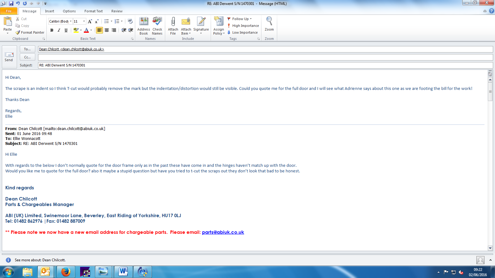 Ellie W (Inactive) added a comment - Dean has replied to me and said that he does not normally quote for the door frame because in the past it has not matched up with the hinges (email attached) he has suggested that he quotes for the whole door instead. I will ask for this but would imagine it will be particularly expensive Dean also suggested using T-cut to get the marks out, not sure whether this has already been attempted by an engineer but it seems like it is an indentation or distortion to it Will await a reply from ABI to see how to proceed with this one