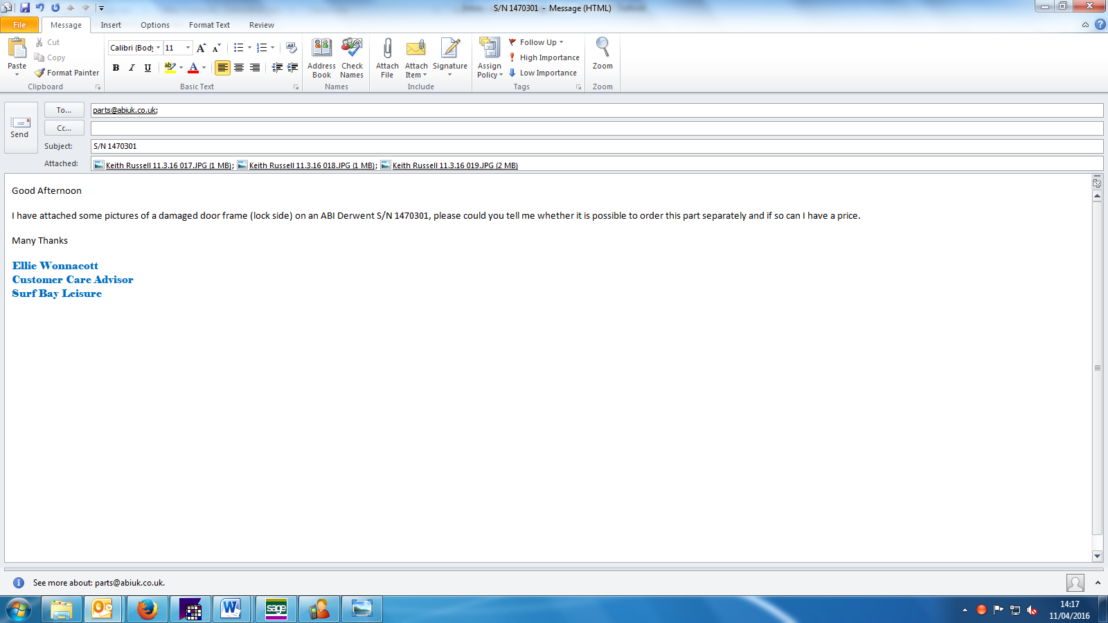 Ellie W (Inactive) added a comment - Emailed ABI and asked for a parts price for this - sent across photographs