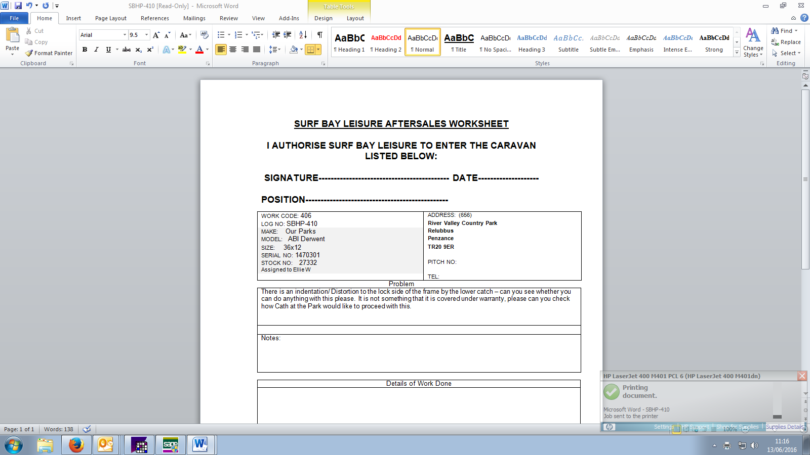 Adrienne Barwell (Inactive) added a comment - I have issued a worksheet for Steve to look at this damage, it is not something covered under warranty. I have asked him to try and sort the dent and then speak to Cath at the site to see how she would like to proceed if at all.