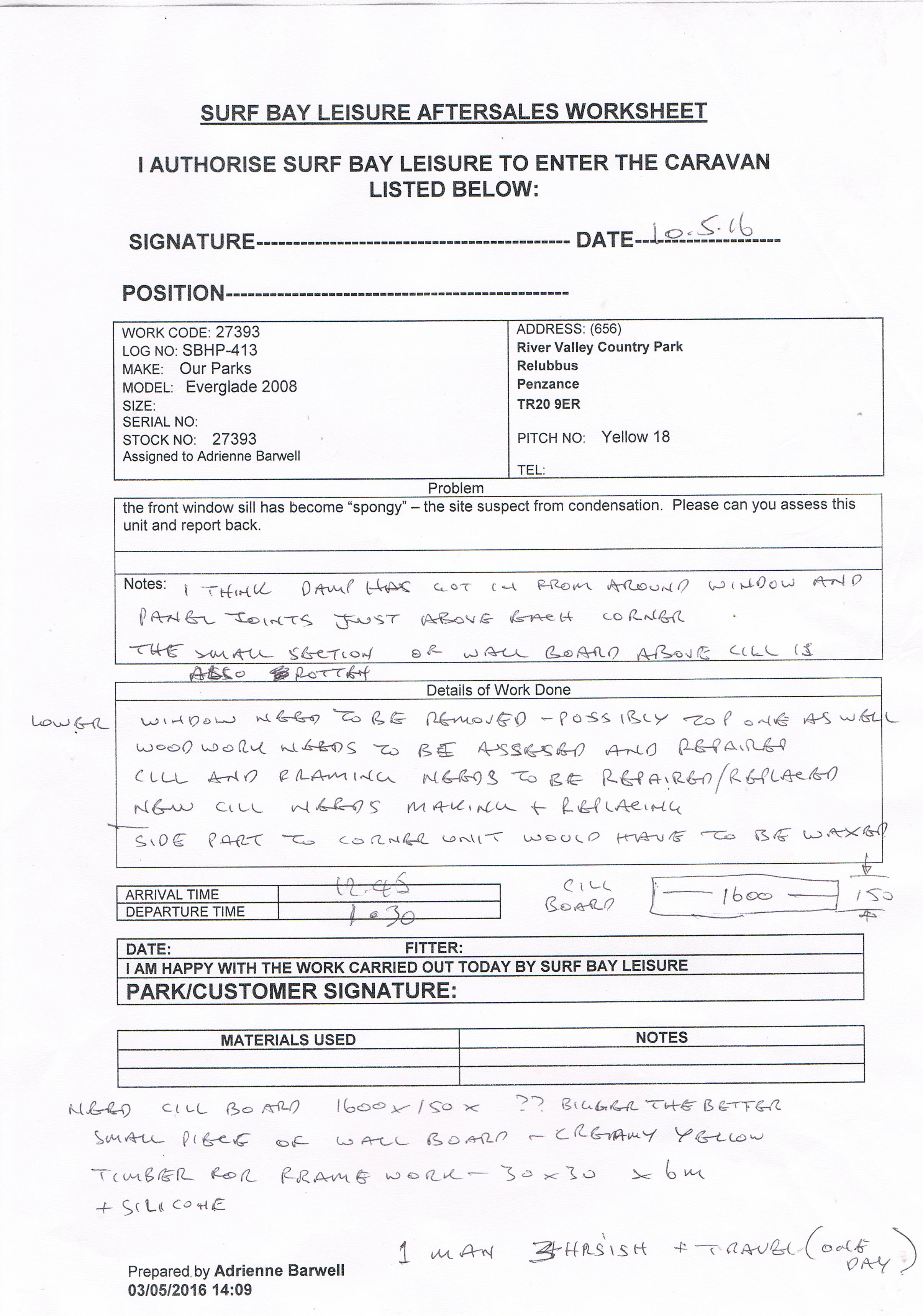 Adrienne Barwell (Inactive) added a comment - keith has advised that the damp has got in around the window, and panel joints just about each corner. The small section or wallboard above the cill is also rotten. Lower window will need to be removed and possibly top one as well. Woodwork needs to be assessed and repaired. New cill needs making and replacing side part to corner unit would have to be waxed Need cill board 1600x150 Bigger the better Small piece of wallboard creamy yellow timber for framework 30x30x6m Silicone