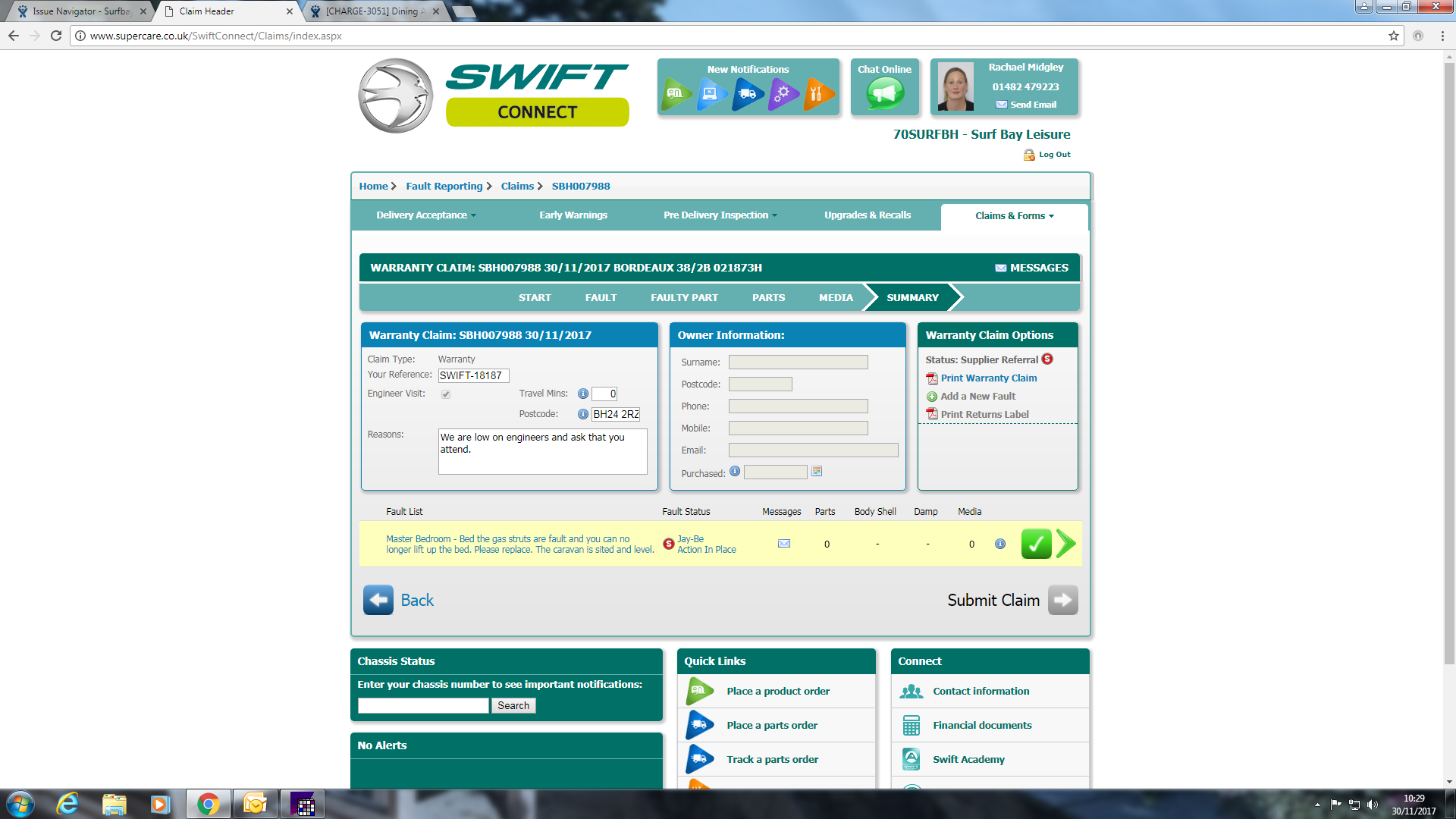 Isabel Smith (Inactive) added a comment - This issue was reported to us via email from Leanne see screen shot attached. I have created the claim and submitted it through to Swift see screen shot attached. Park updated.