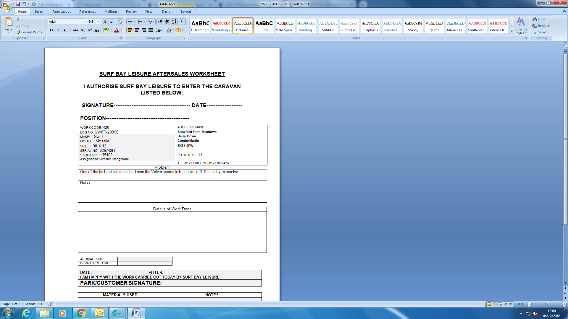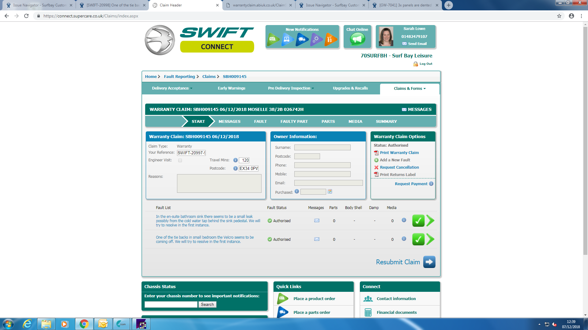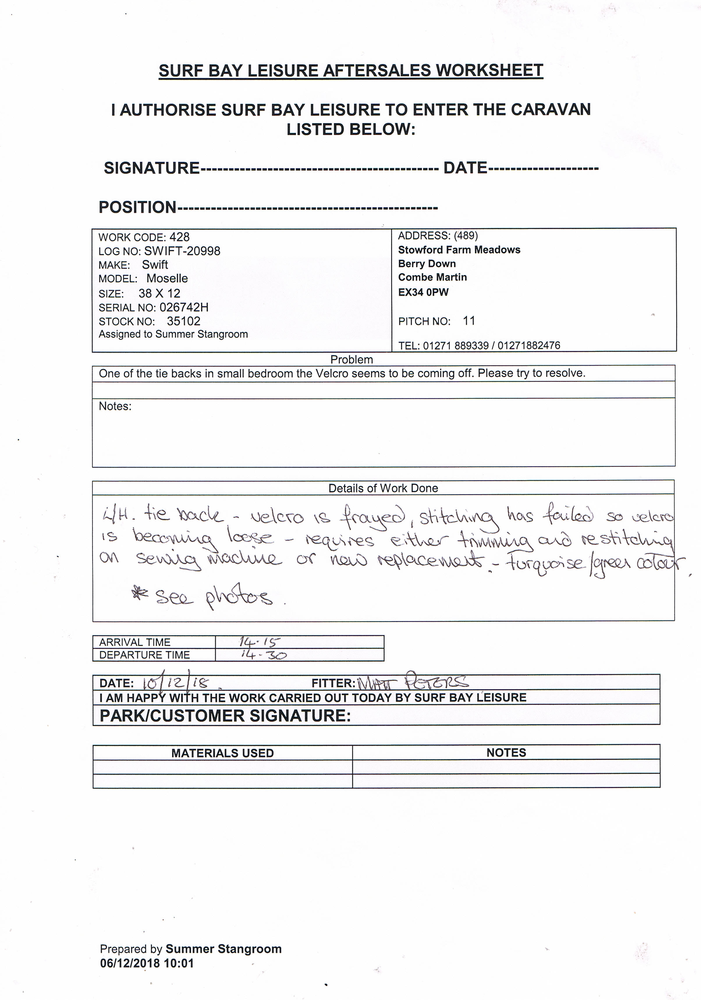 Park emailed to report. I have submitted to Swift and done a worksheet.