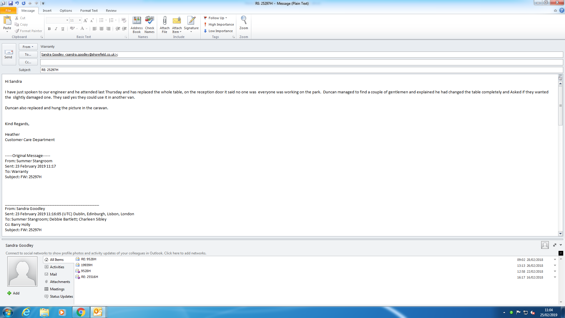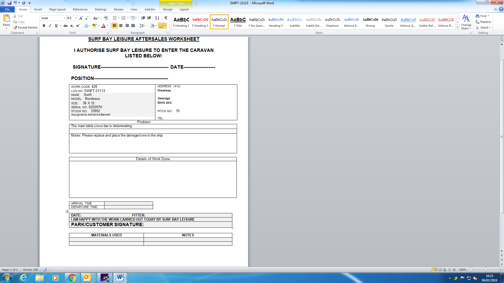 Sandra emailed to see when we were going to rectify the table I have emailed Sandra confirming all completed last Thursday