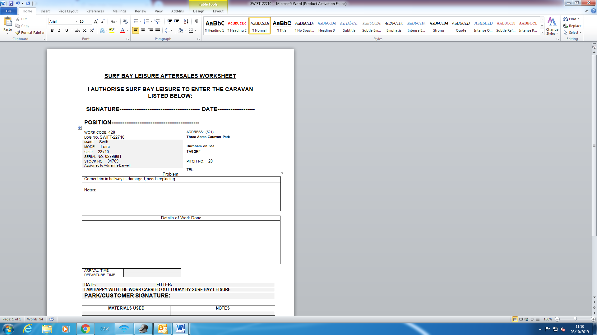 Parts received I have issued a worksheet and placed on the rack