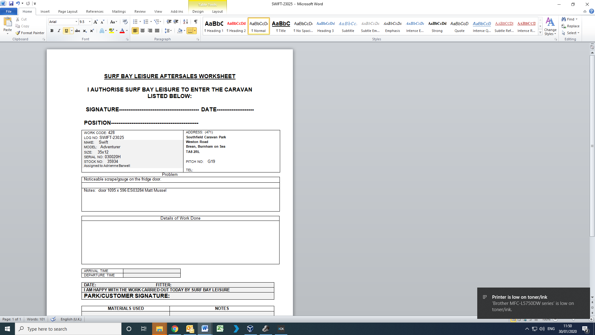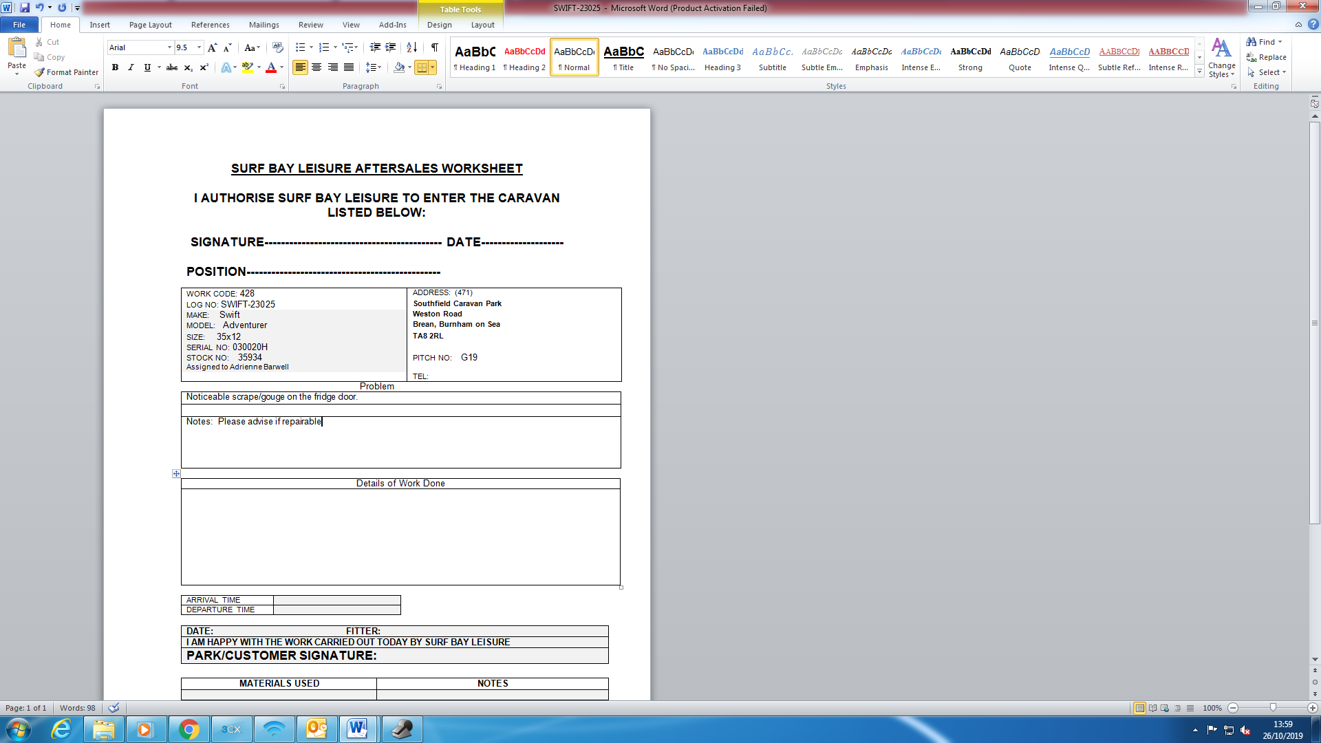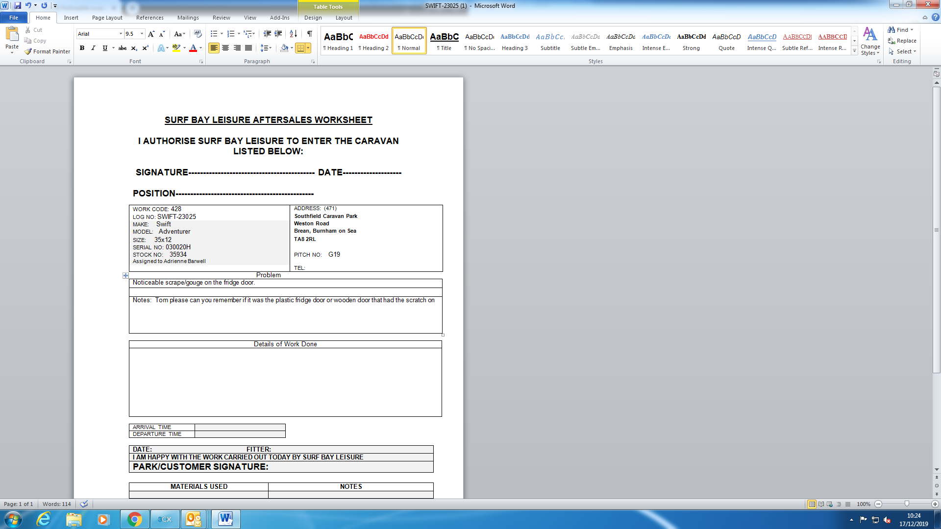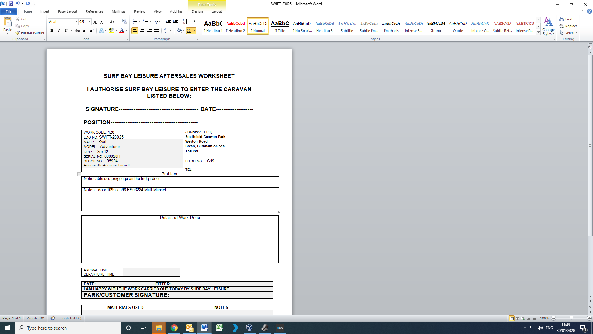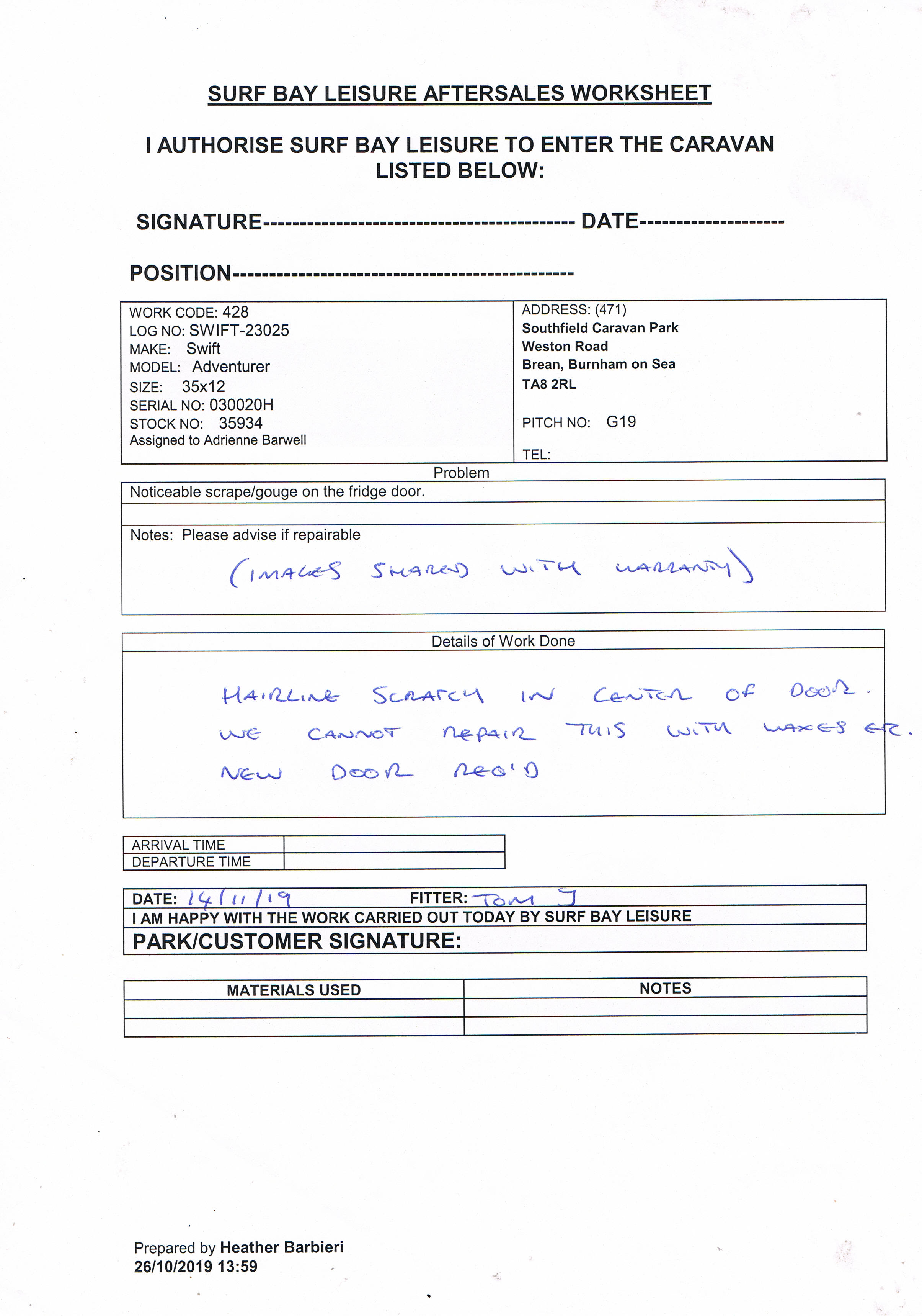 Claire Folland added a comment - Tom attended 14-1-19 worksheet attached, hairline scratch in centre of door, can not repair this with waxes, new door required, submitted new claim into swift