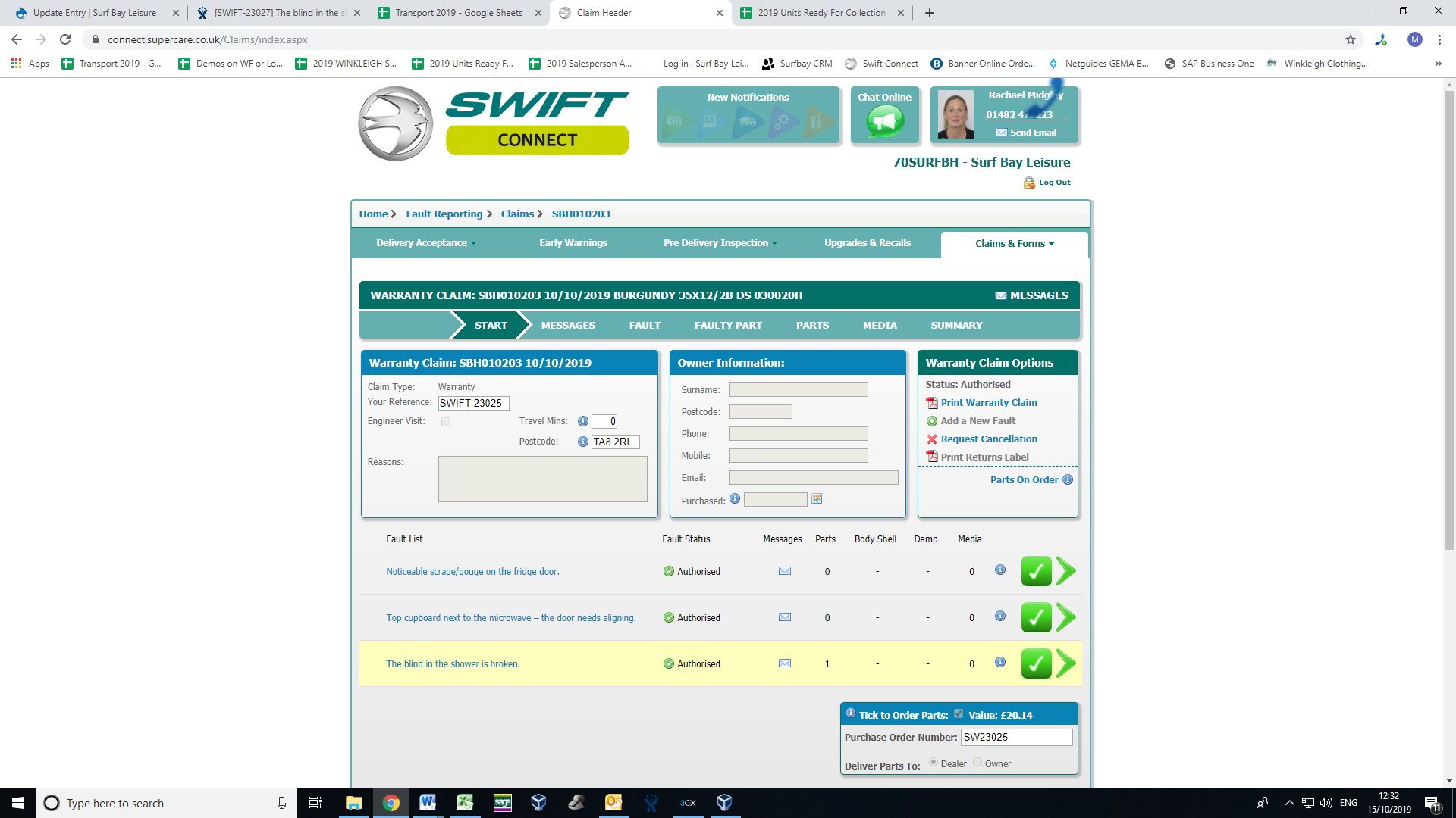 Swift have authorised claim, parts on order