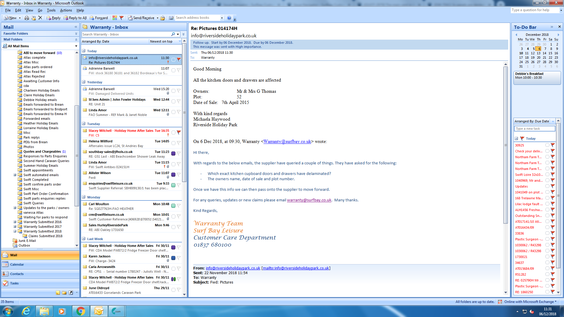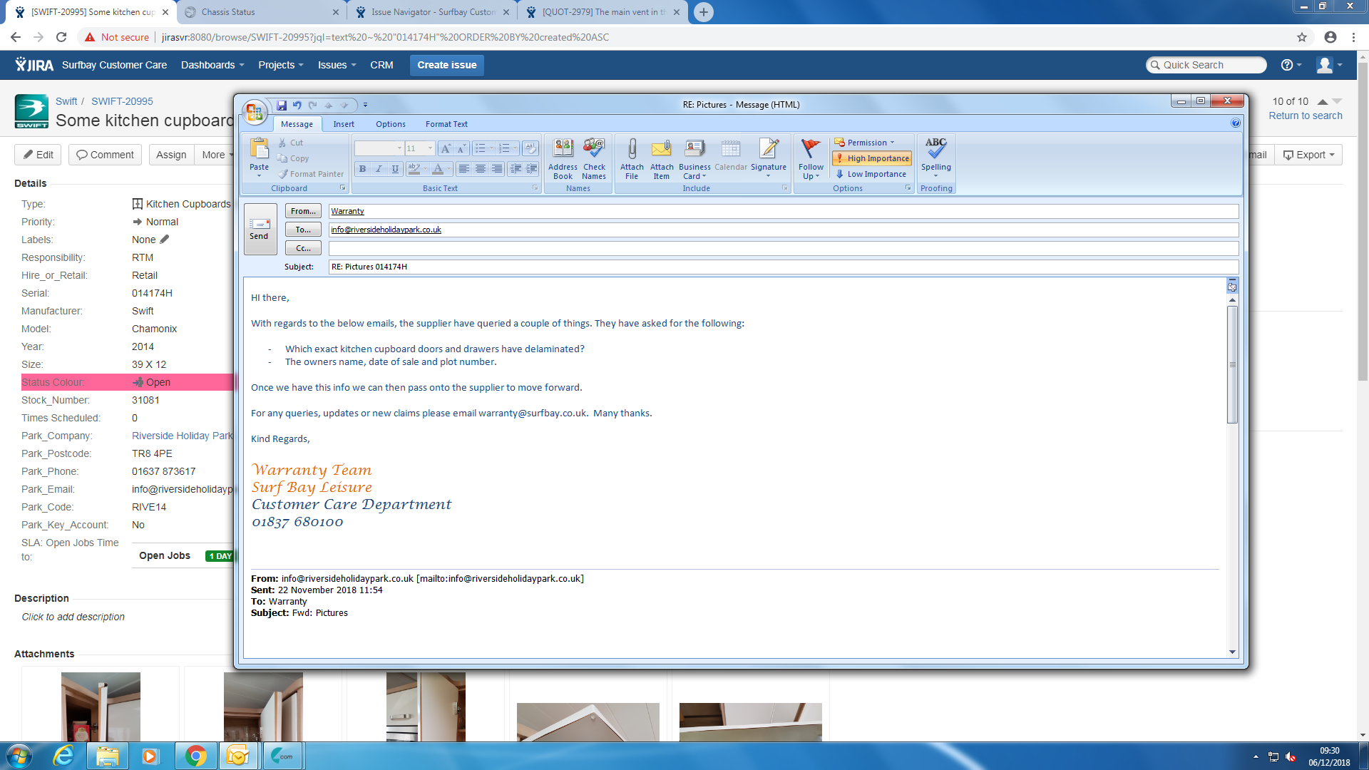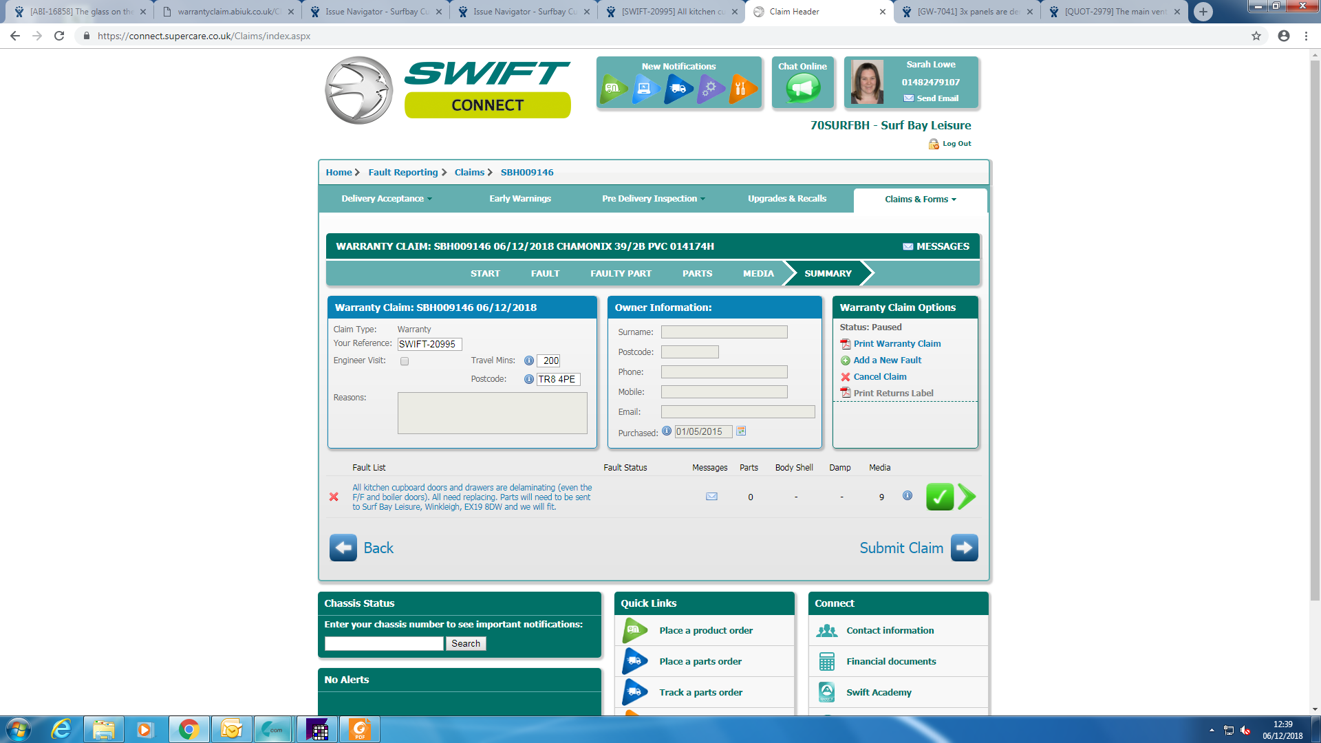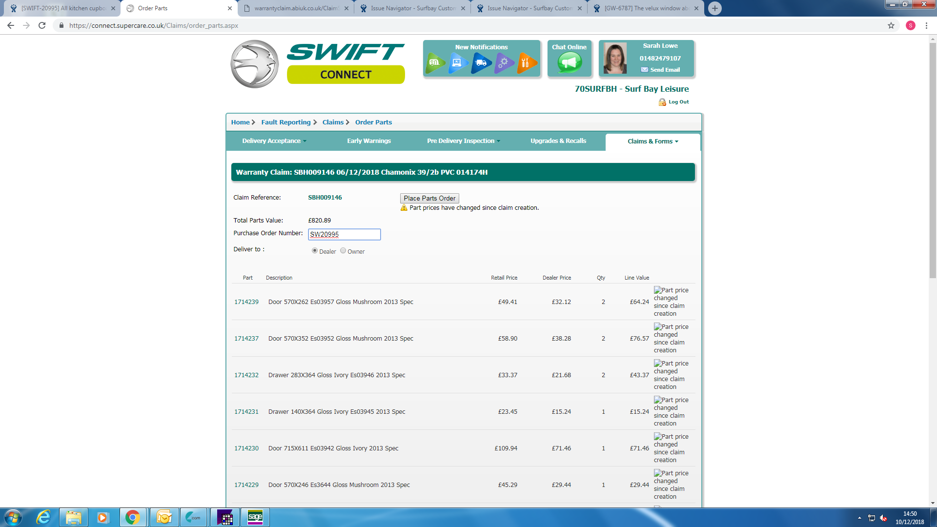 | Summary | All kitchen cupboard doors and drawers are delaminating (even the F/F and boiler doors). | All kitchen cupboard doors and drawers are delaminating (even the F/F and boiler doors). Swift to provide parts as GW and Surf Bay to fit parts as GW. |