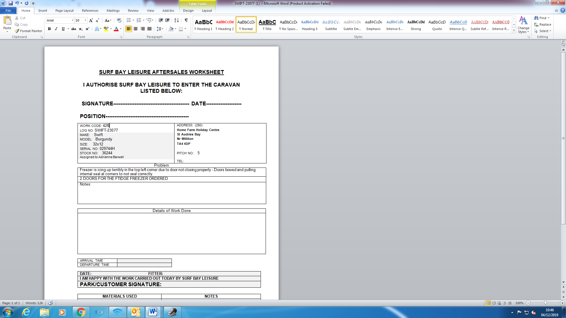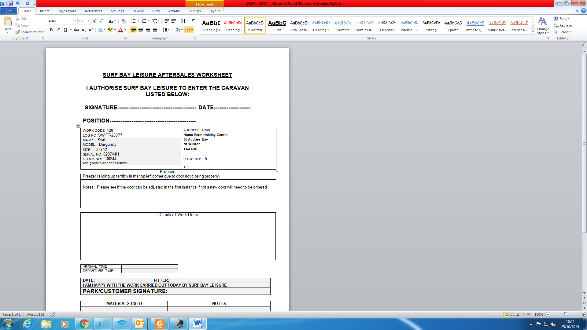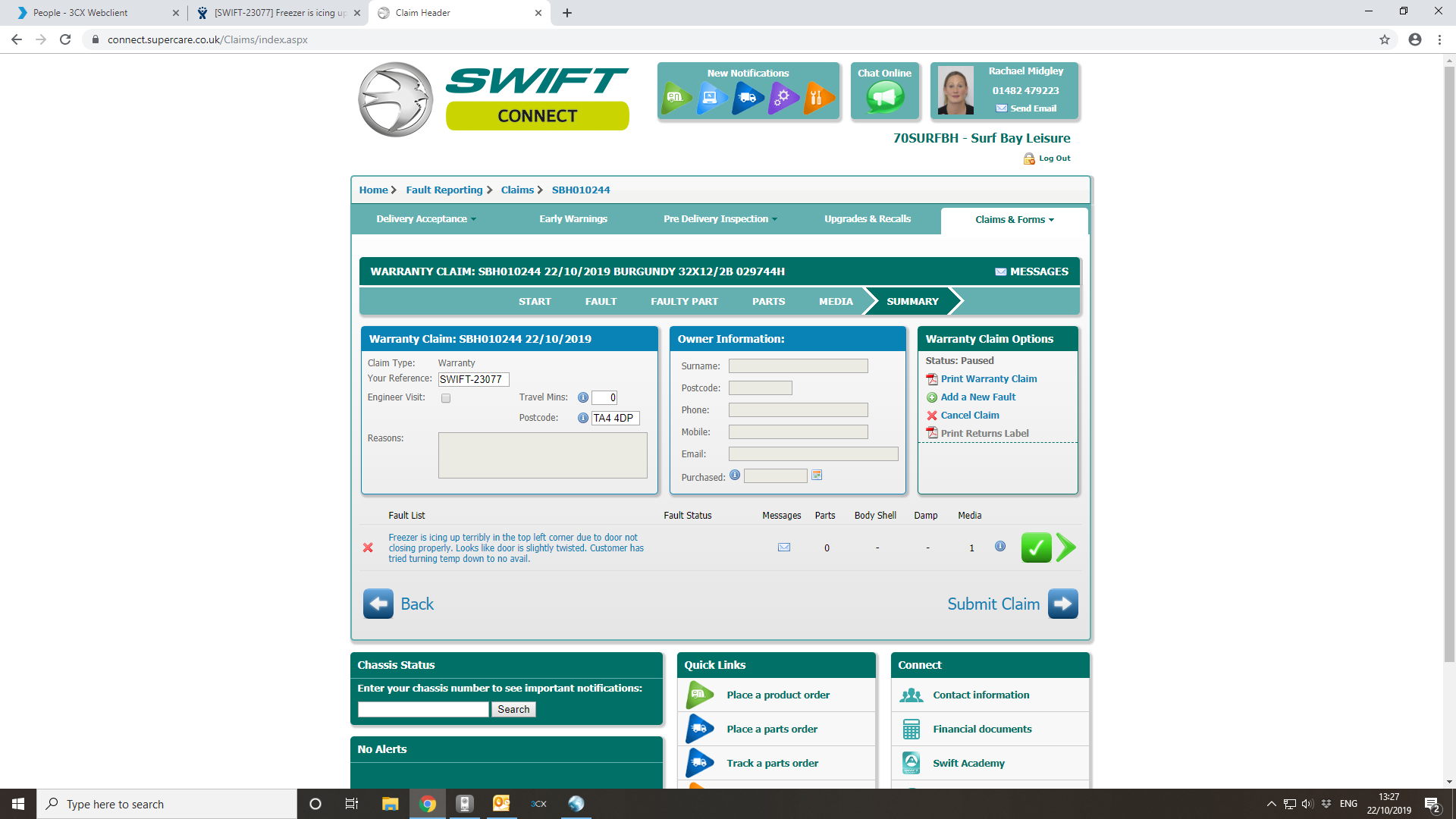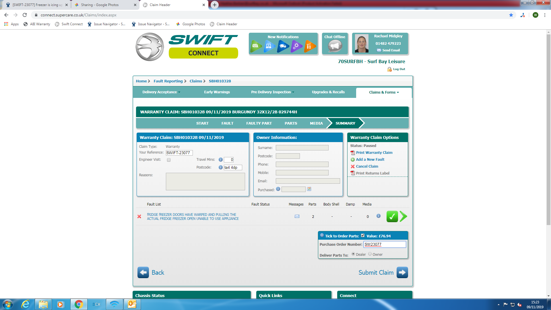 I have opened new claim (SBH010268) as per the worksheet returned by Tom, I have raised a Part Enquiry & submitted to Swift.