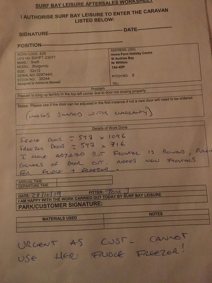 Tom has replaced the doors but the customer is still not happy that the freezer is completely sealed and has requested a new freezer