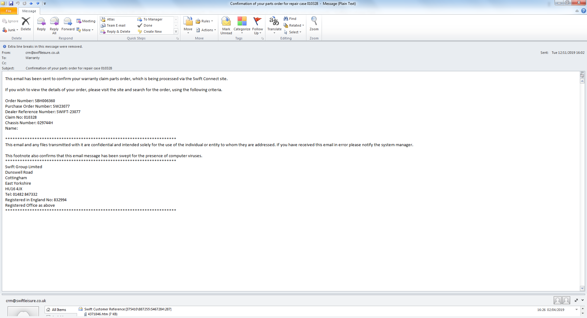 Michelle Brooks (Inactive) added a comment - I have opened new claim (SBH010268) as per the worksheet returned by Tom, I have raised a Part Enquiry & submitted to Swift.