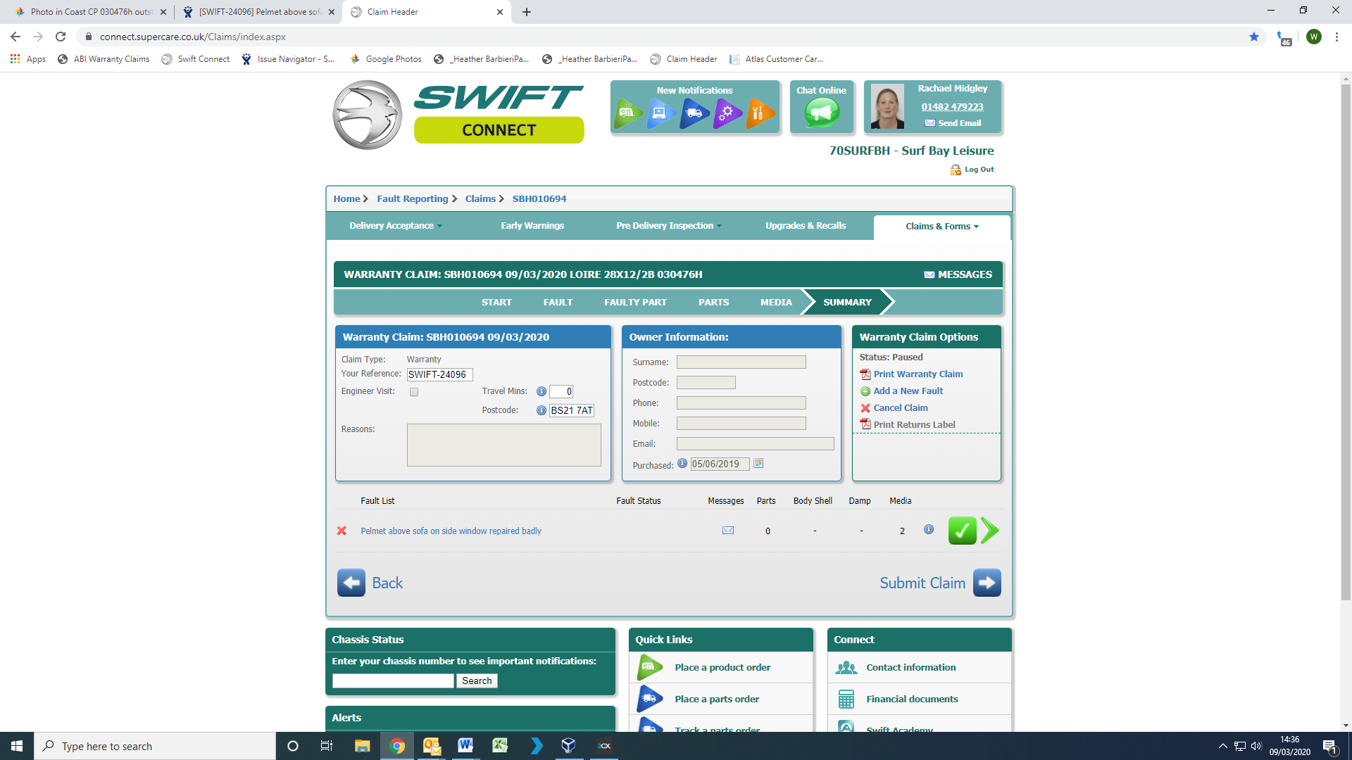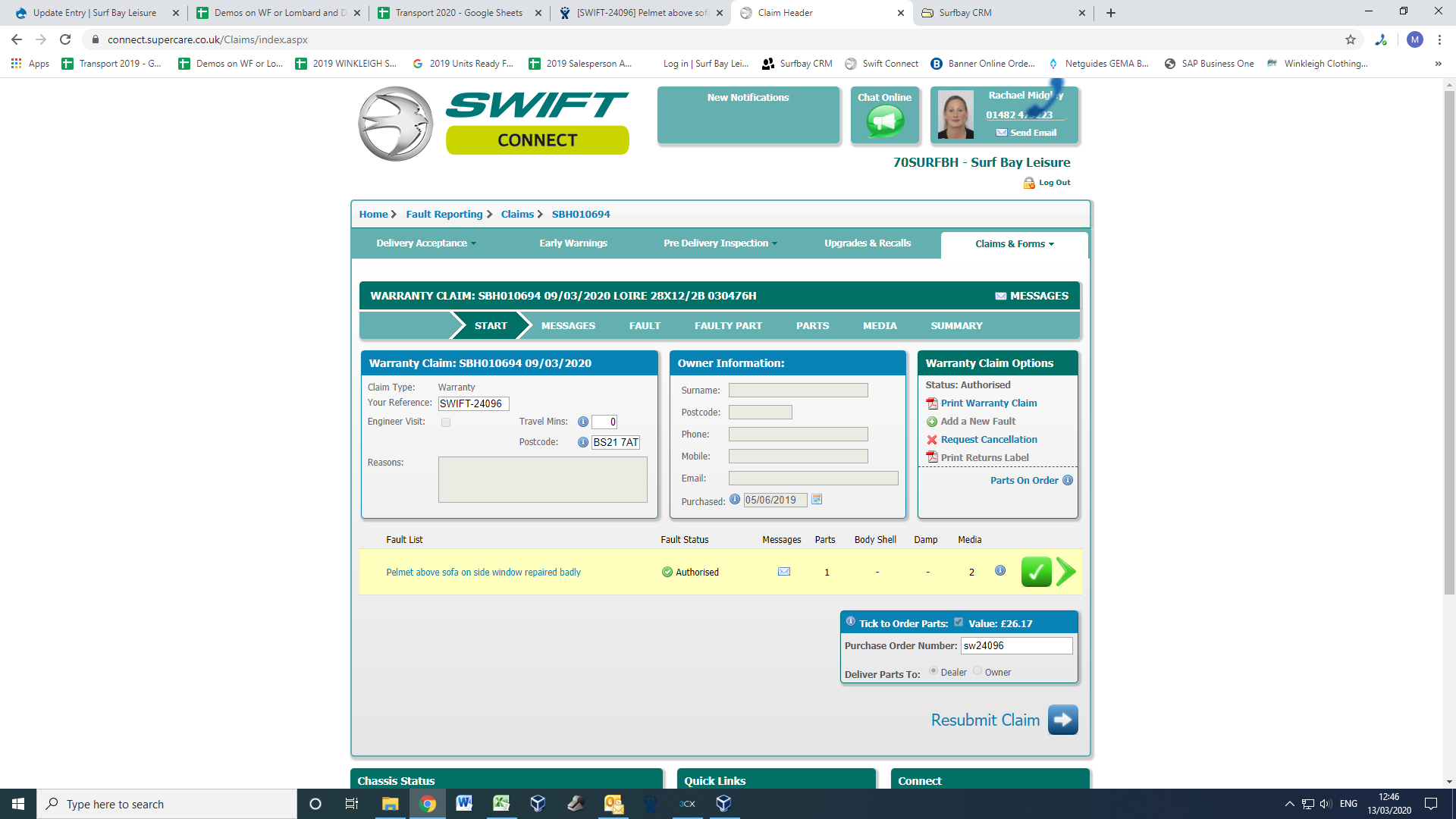 Michelle Brooks (Inactive) added a comment - Swift have authorised claim, parts on order.