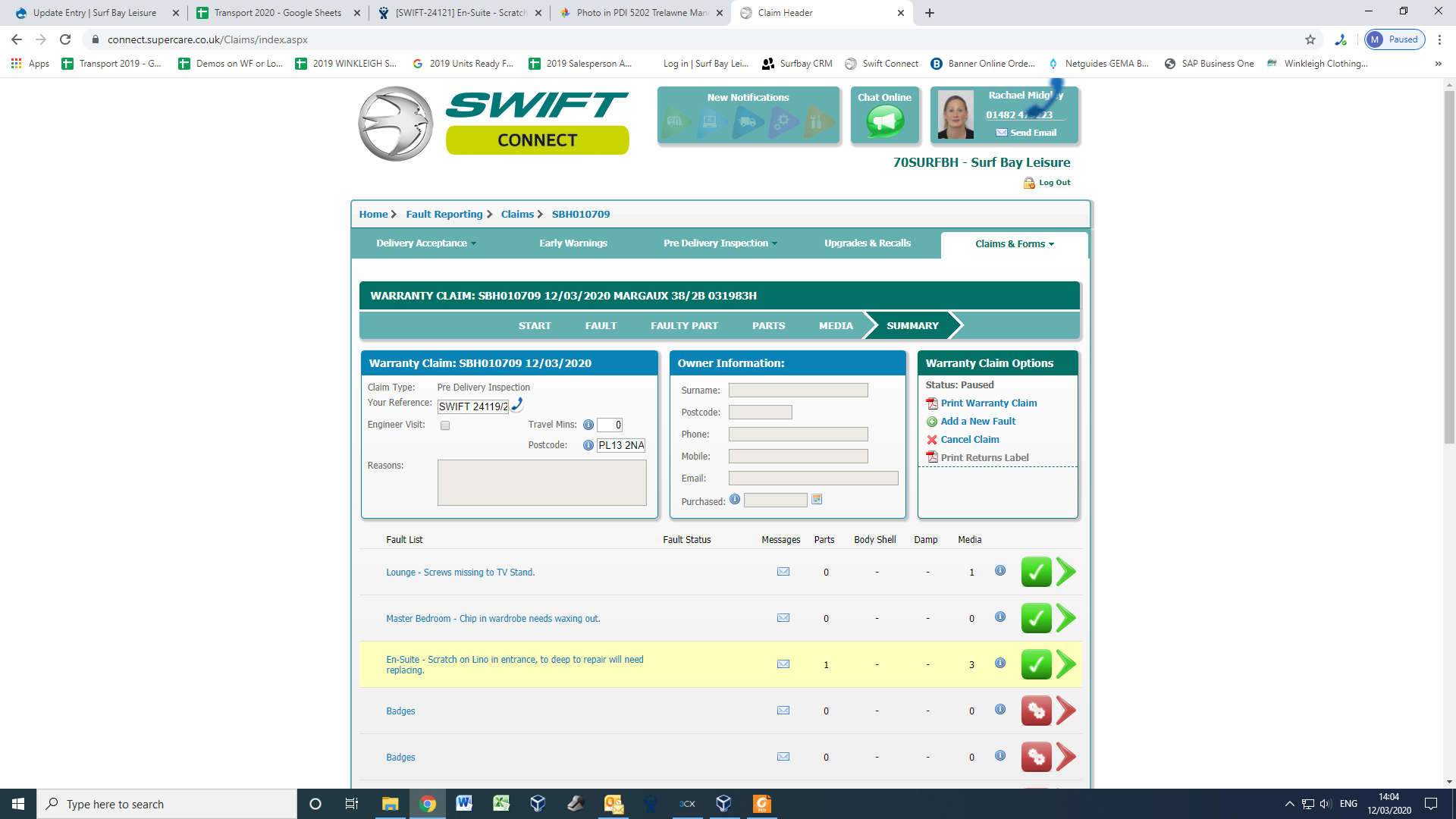 Michelle Brooks (Inactive) added a comment - Swift have authorised claim, parts on order.