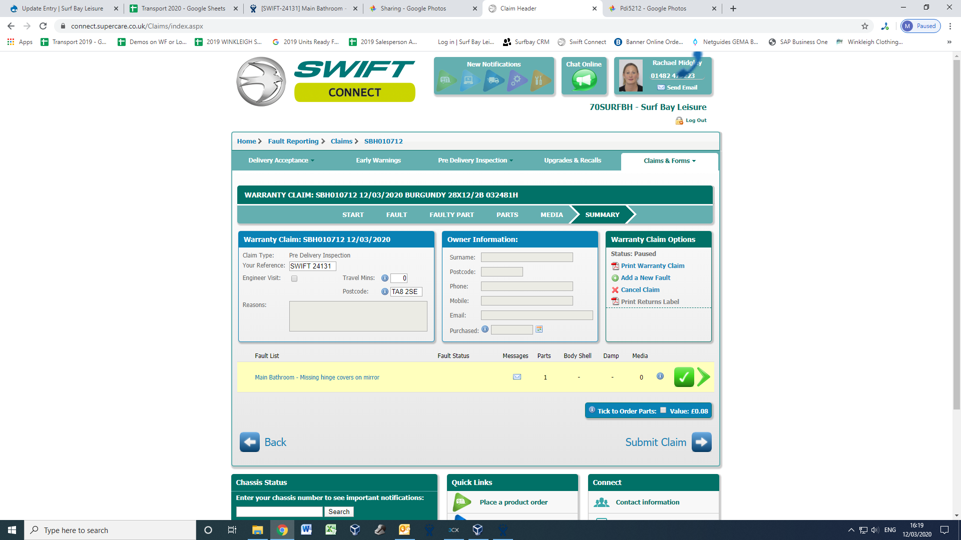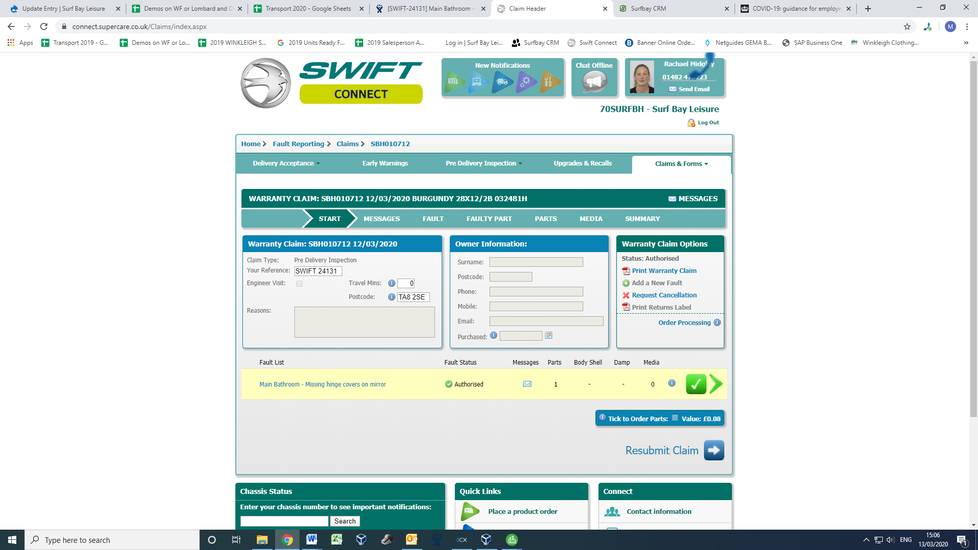 Michelle Brooks (Inactive) added a comment - Swift have authorised claim parts on order.