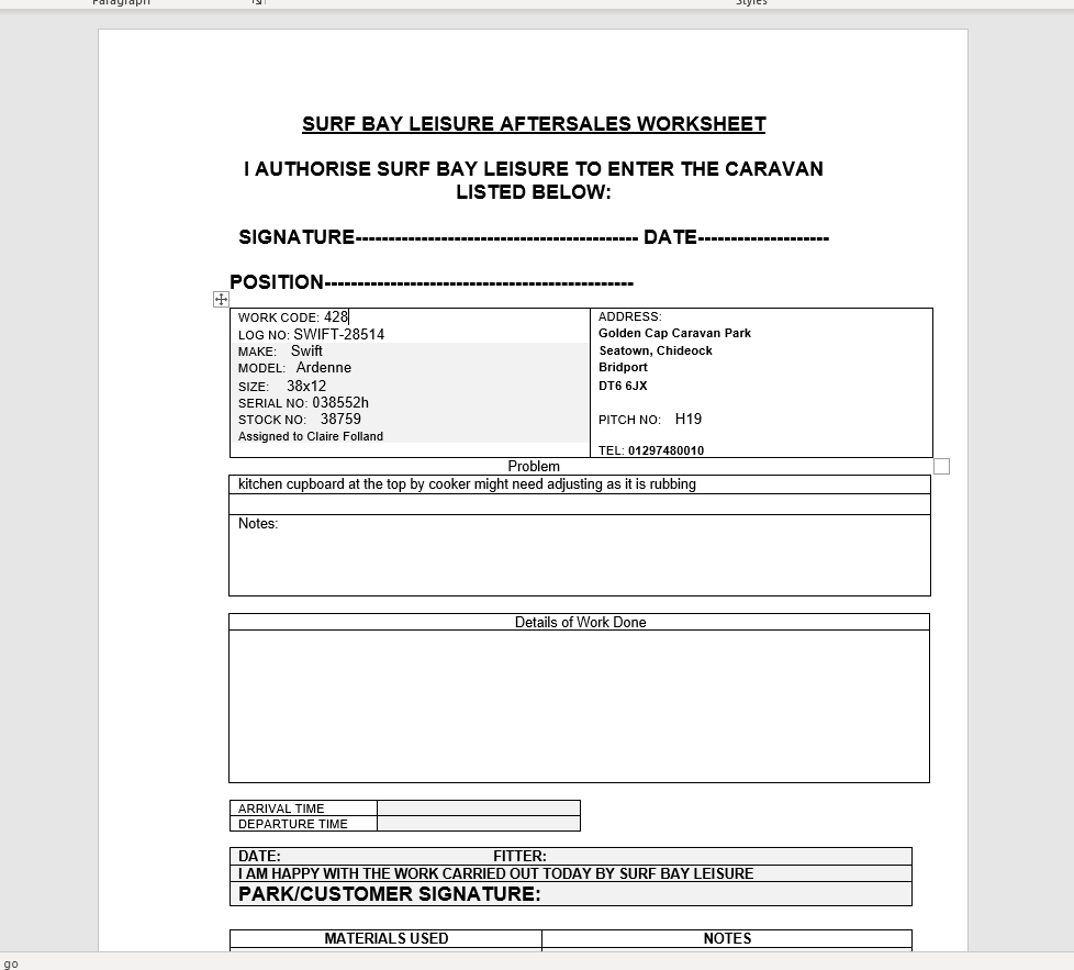 Work completed by Steve/Graham - 12/05/22.