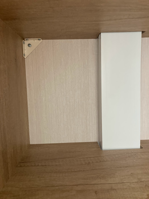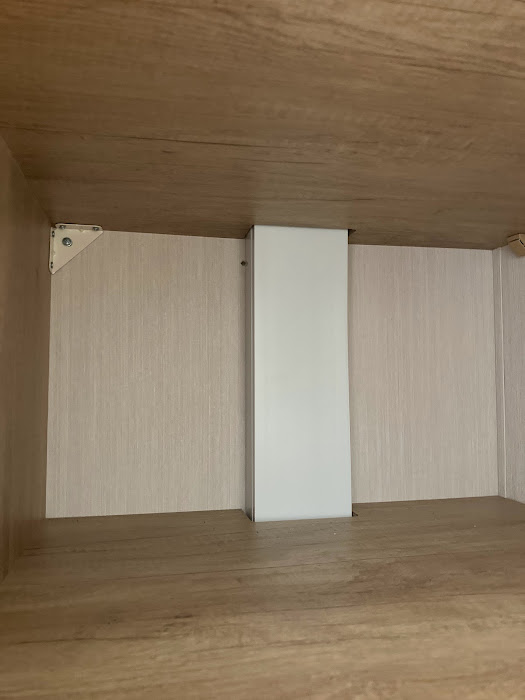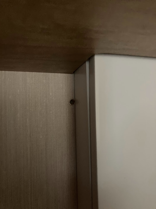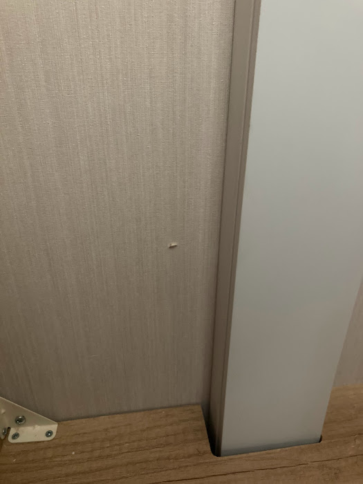 twin bedroom wardrobe wallboard has chip in bottom LHS and hole in top LHS