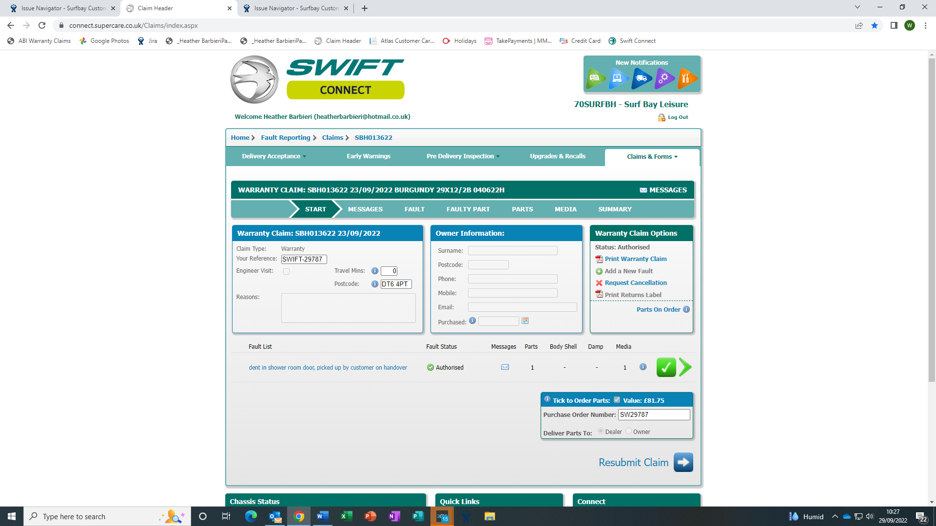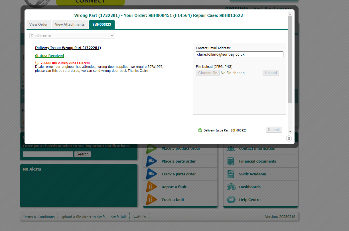 swift have authorised this claim and parts on order