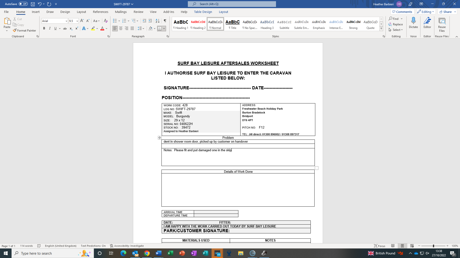 Claire Folland added a comment - Duncan attended,worksheet attached, wrong door supplied, should be 597x1976, advised swift on connect