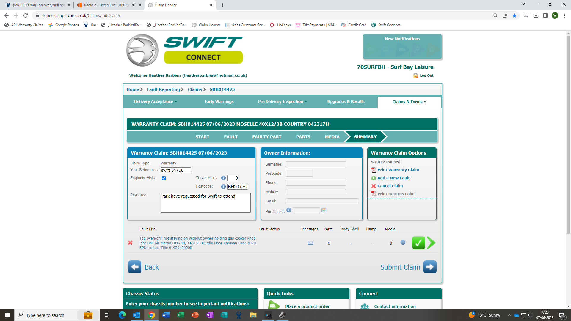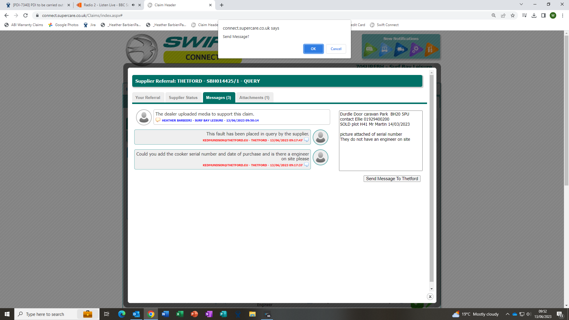 Heather Barbieri (Inactive) added a comment - Swift Supplier Referral Updated: SBH014425/1 Swift Supplier Referral: SBH014425/1 has been updated by Thetford Chassis: 042317H Owner: Dealer: Surf Bay Leisure Fault: Top oven/grill not staying on without owner holding gas cooker knob Plot H41 Mr Martin DOS 14/03/2023 Durdle Door Caravan Park BH20 5PU contact Ellie 01929400200 Plot H41, Durdle Door Caravan Park, BH20 5PU Supplier Ref: THFD211613 Comments: Status: ACTON