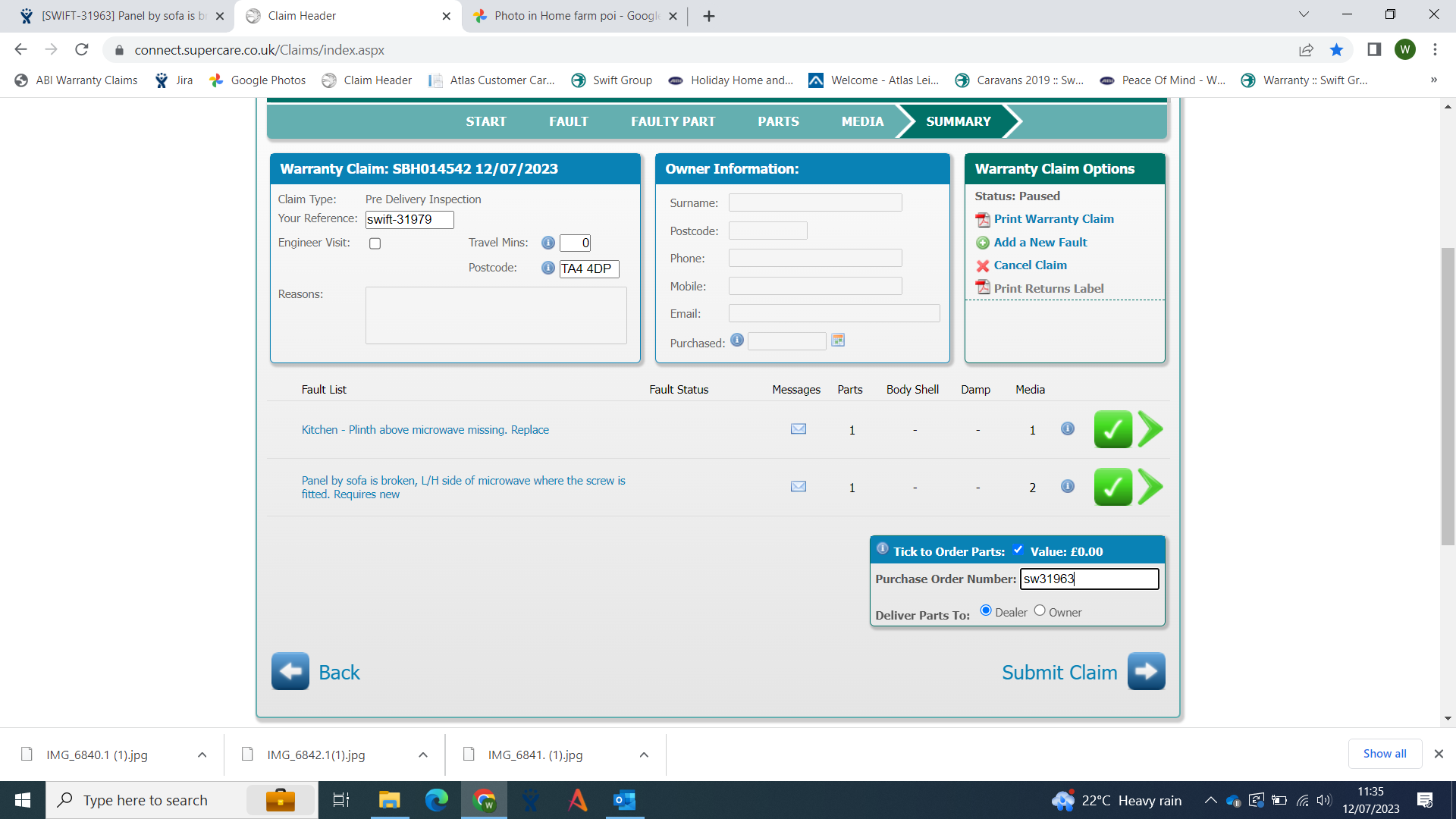Authorised by Swift, parts on order