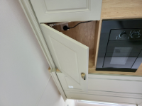 Kitchen - Cupboard door above microwave sits lower than other two, adjust.