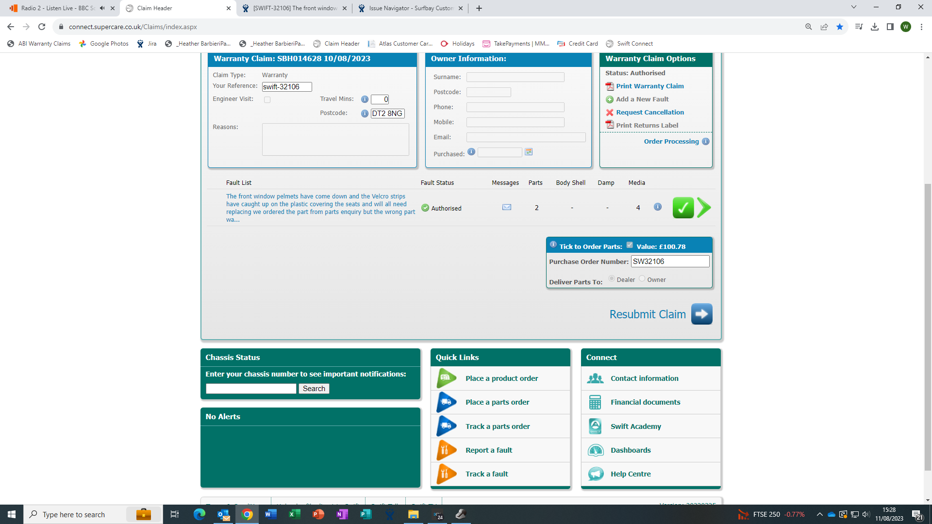 swift have authorised this claim and parts on order