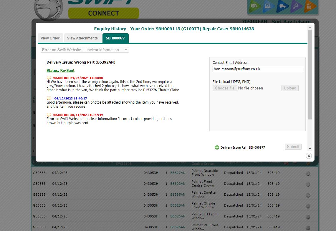 incorrect colour parts received. Unable to raised a parts issue on swift portal so have emailed Matt to ask for assistance.