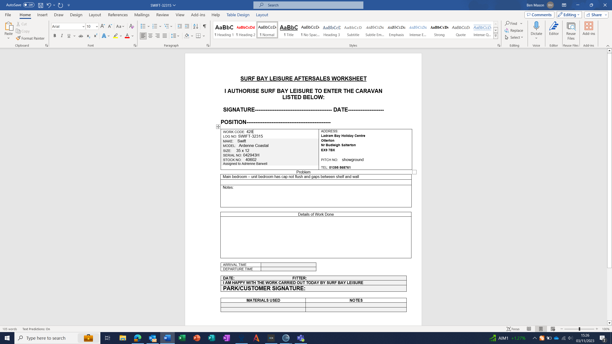 Ben Mason (Inactive) added a comment - auth, job card printed.
