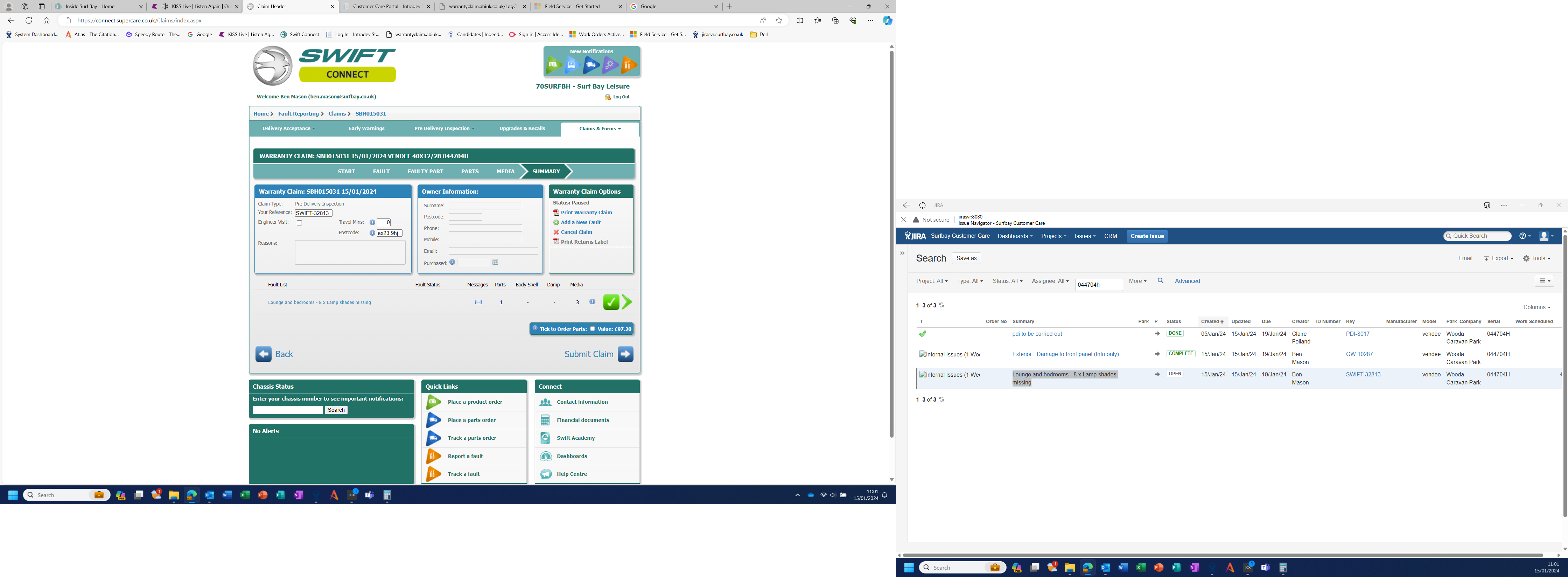 Auth by swift, parts on order.