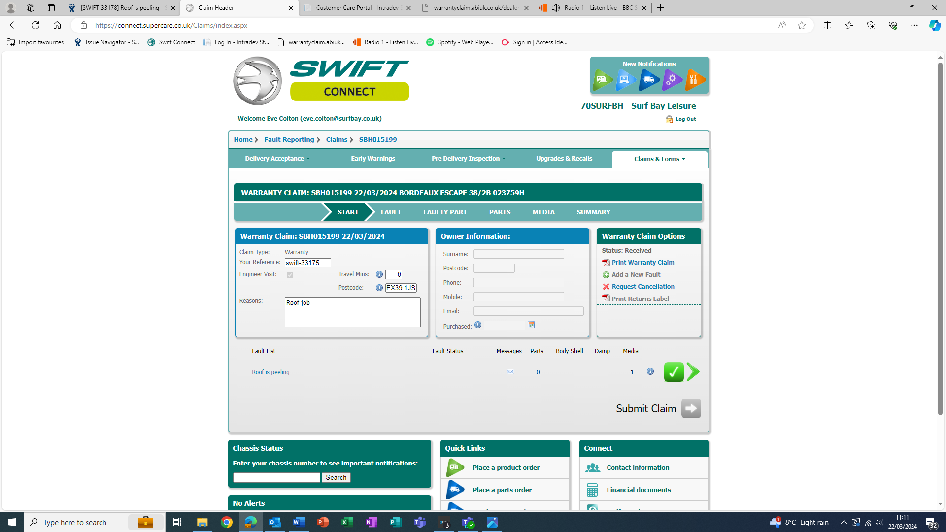swift attended on 15.04.24 and have said they need to replace the roof - parts ordered and needs scaffolding to be put up.