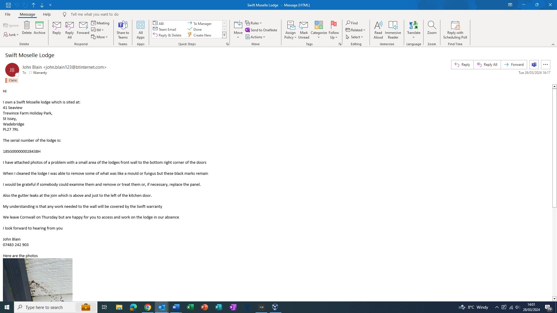 Claire Folland added a comment - Hi Claire > > Any update on when this might be done? > > Can the work be carried out while the lodge is occupied? > > I ask because someone will be staying in the lodge from about 9 July to the beginning of September > > John > Sent from my iPhone Thanks Claire The dates I gave you involve other family members so cannot be changed This means the work cannot be done until September at the earliest After that it will be just us using it and we can be flexible as long as we have a little notice Thanks again John Sent from my iPhone