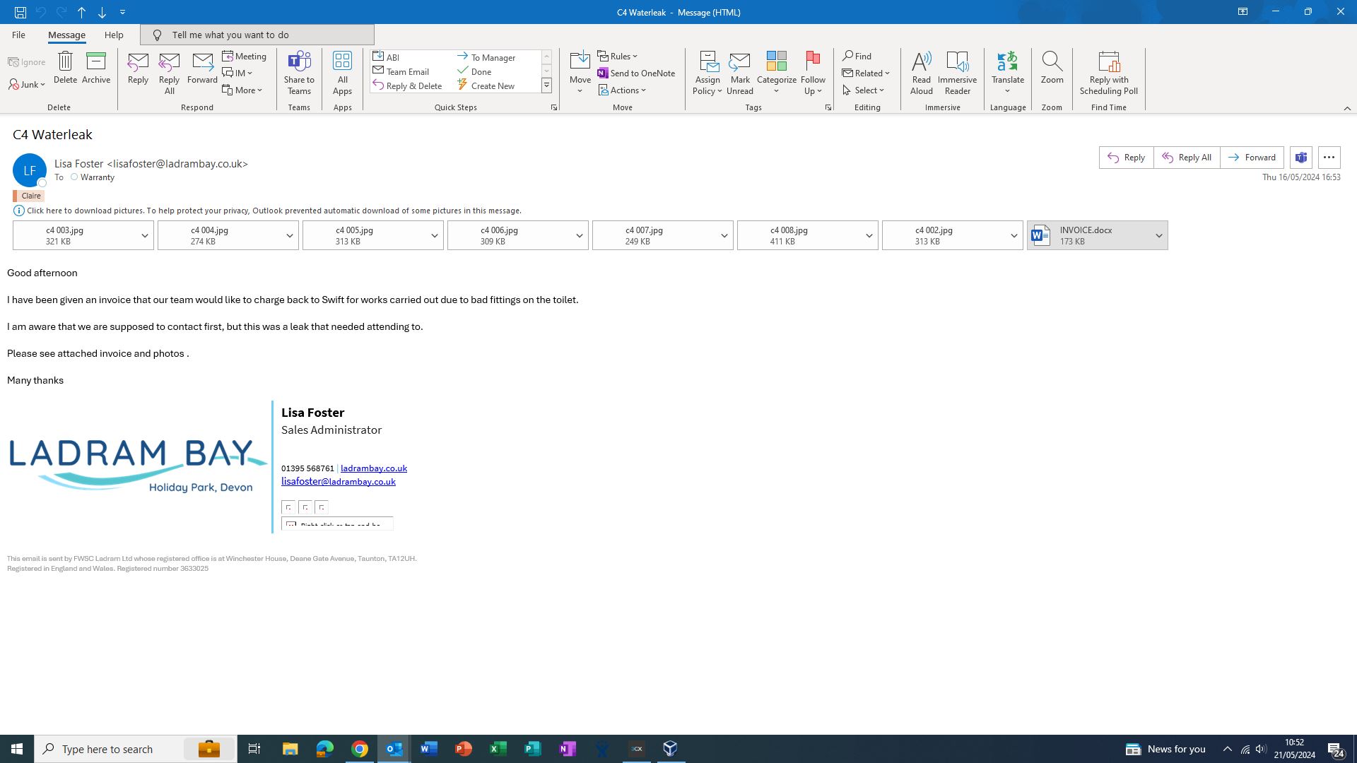I have been given an invoice that our team would like to charge back to Swift for works carried out due to bad fittings on the toilet.