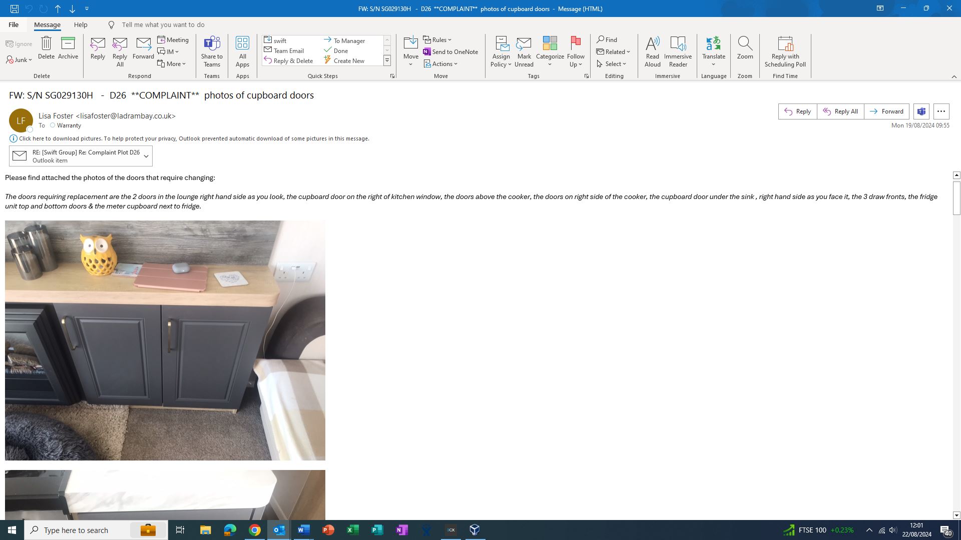 Claire Folland added a comment - Hi Matt, All good thanks hope you are too. Based on our records, the customer had a total of five doors replaced last year on three separate occasions, we only cover doors that have actually delmainated. Since the original supplier, who provided the doors at the time of the van’s build, is no longer trading, we offer a goodwill policy to supply the doors free of charge within five years of the date of purchase. However, this van is now beyond the five-year period and outside our goodwill policy. Given that the customer had replacement doors just last year, I am willing to make an exception and agree to replace all the doors in the kitchen and lounge with parts only, provided you are willing to contribute to this? Thanks, Helen Helen Crofts Holiday Home Aftersales Manager