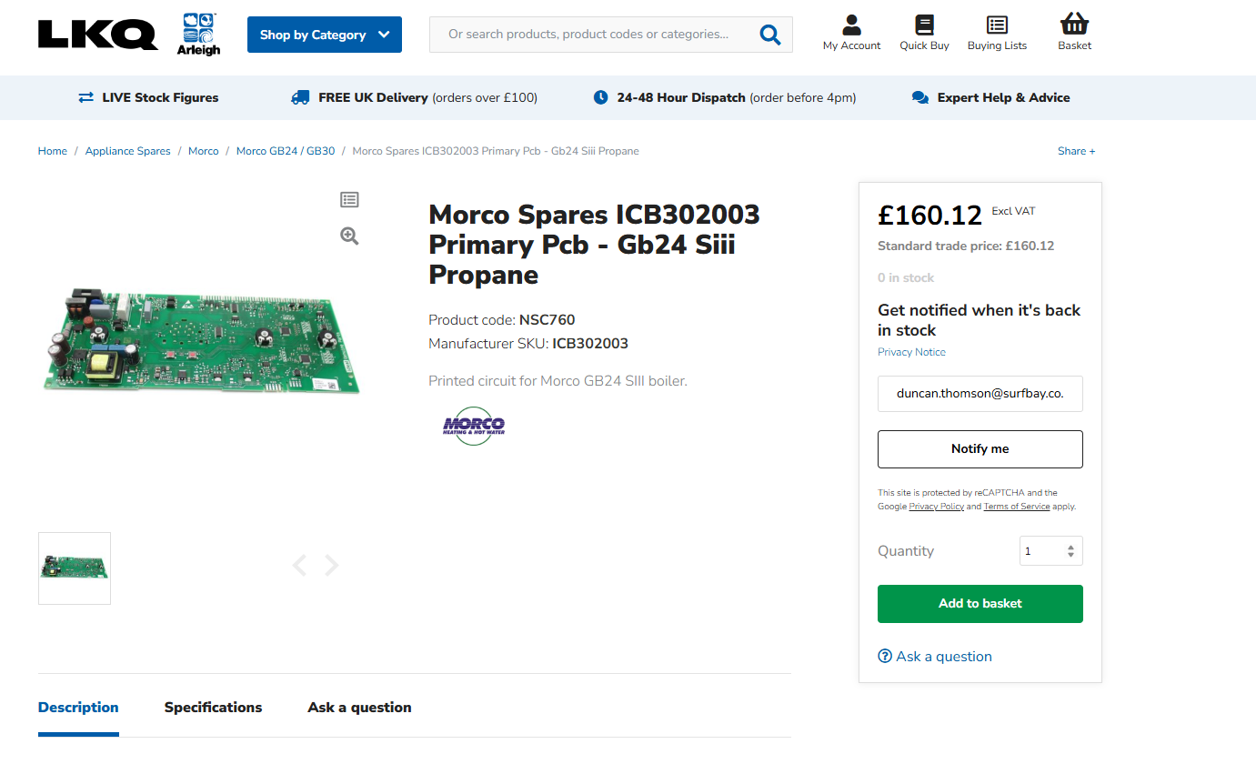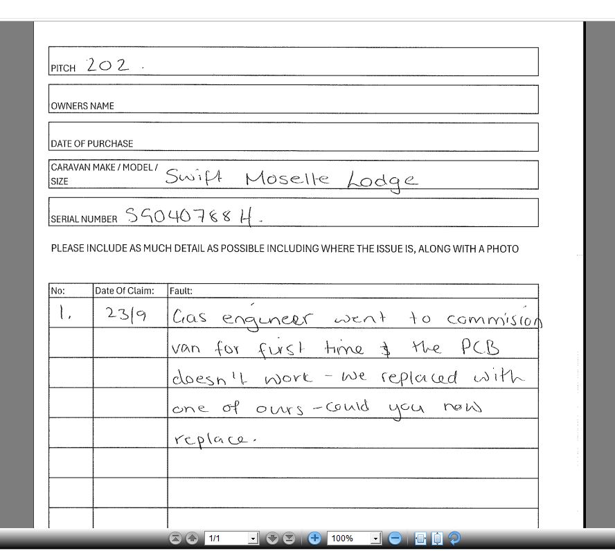 swift have sent a vans CU which isnt what the park require and have found the part required from Arleigh, unsure if we need to go back to swift for this part or possibly morco
