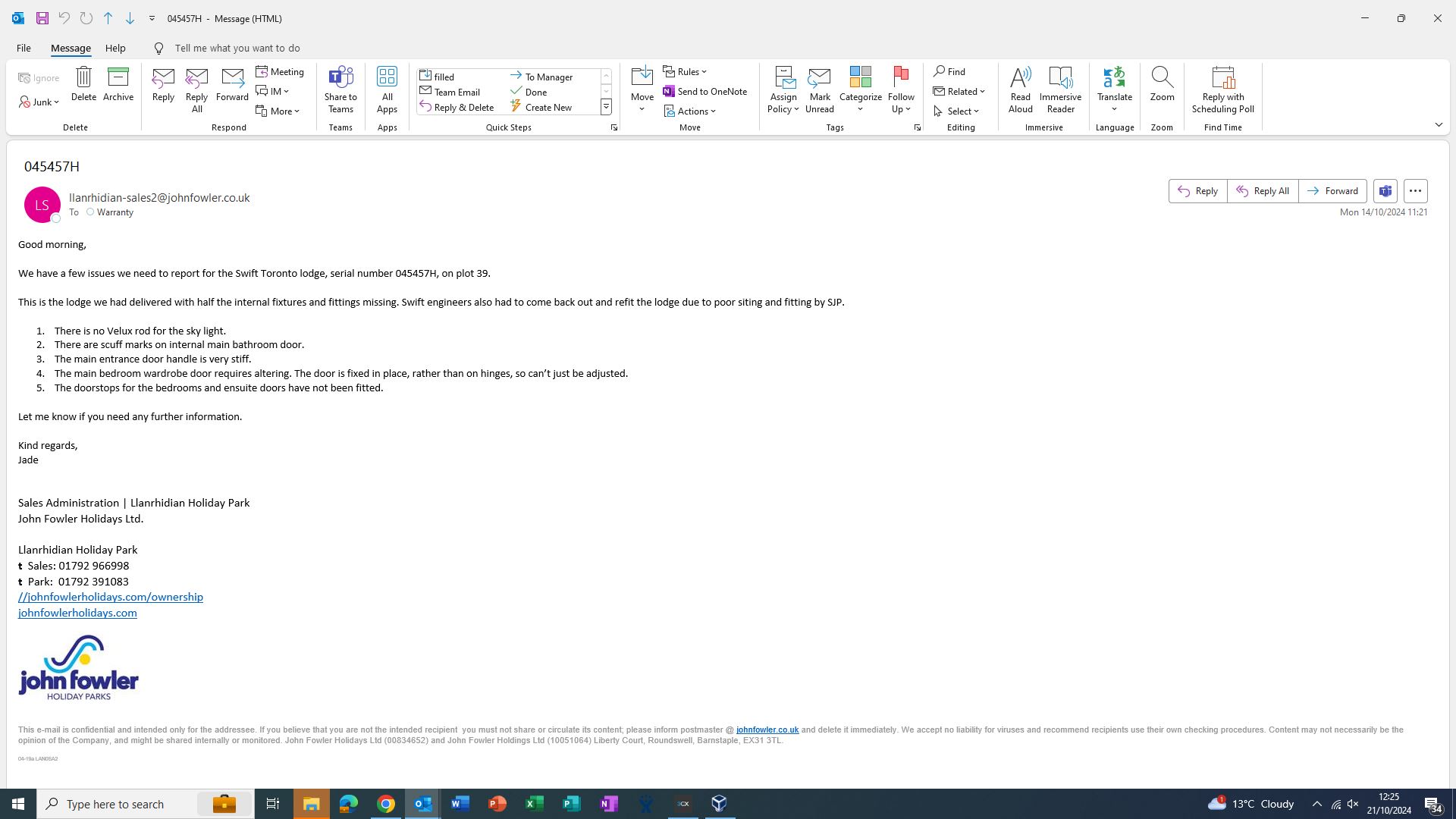 Following my VM, Our engineers assessement has concluded the below re the Roof issue @ Llanrhidian Holiday Park SA3 1EU plot 39
