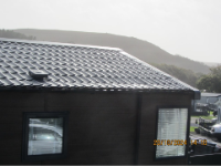 of area of lodge roof which has either been damaged/collapsed/ installed incorrectly. During the high winds we noticed noises coming from the rear of the lodge and also in kitchen area which caused us to inspect the roof. The dip in the roof at the front non entry of the lodge was then noticed.