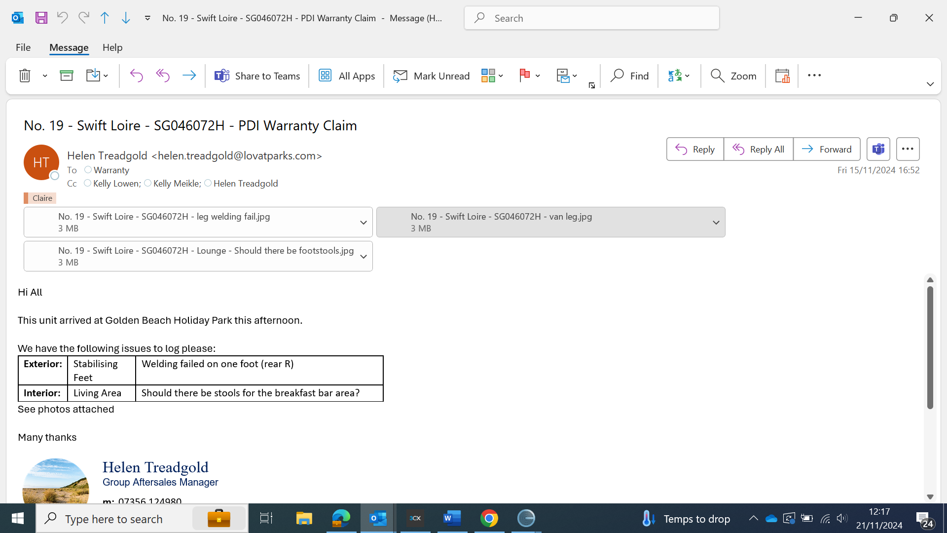 Claire Folland added a comment -   Rachael (Holiday Homes) 29 Jan 2025, 12:21 GMT Hi Claire,   I will ask that this is collected and delivered to the Park.   Thanks Rachael