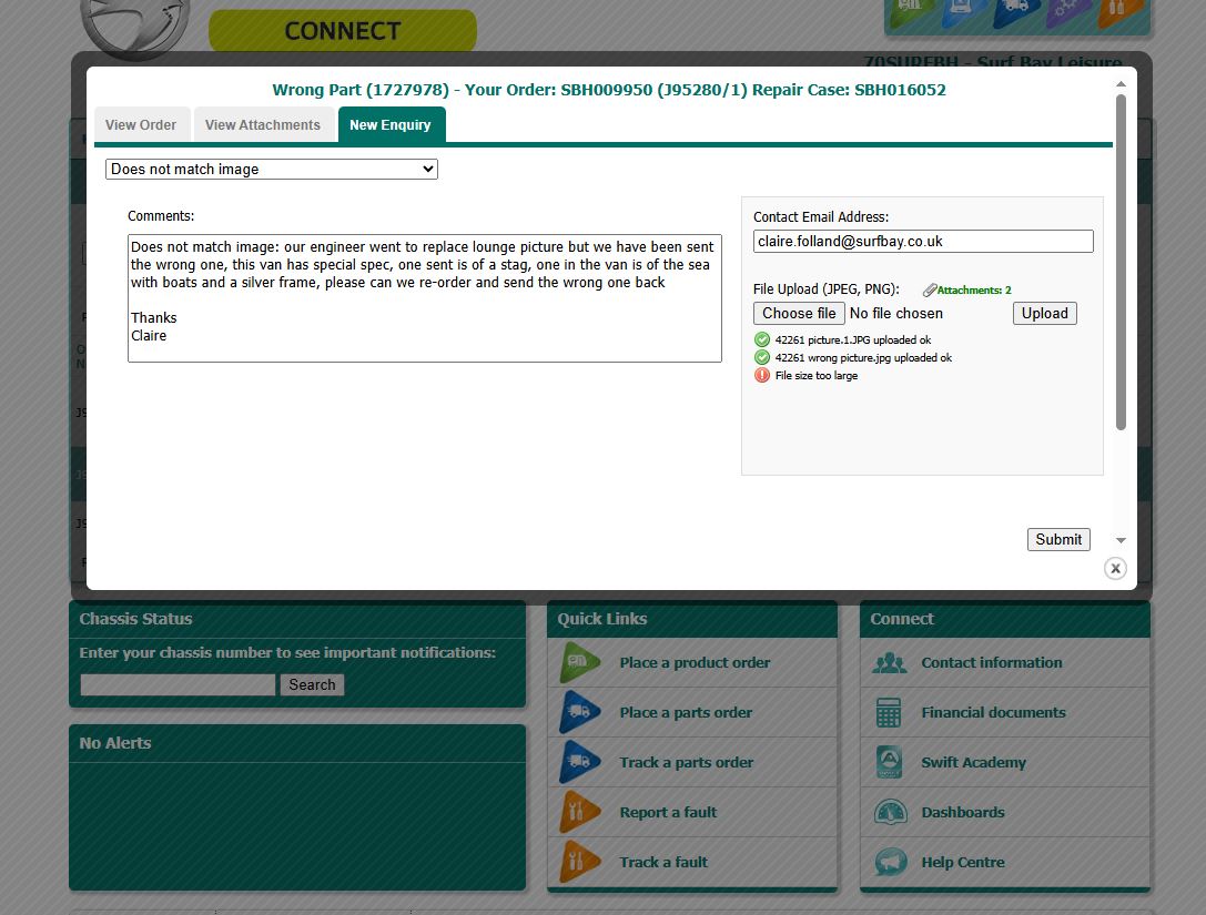 Claire Folland added a comment - Duncan attended 24-3-25, wrong picture has been sent, we have been sent one of a stag, one in the van is of boats with a silver frame, advised swift on the portal