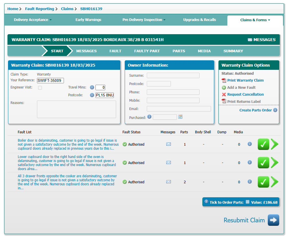 Claim has been authorised by Swift. Darren had authorised for the doors/drawers to be ordered as goodwill if neccesary, but not been needed.