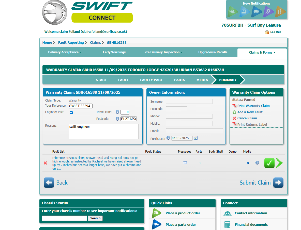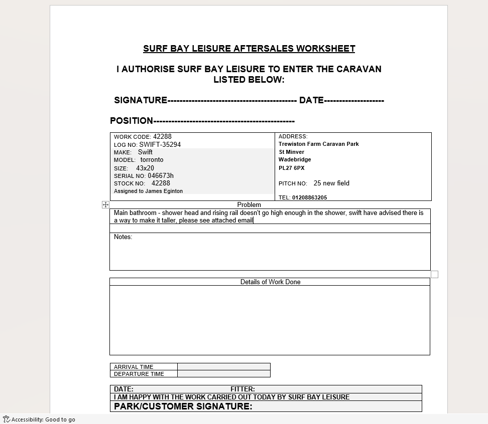 Claire Folland added a comment - Hi Claire   Sarah has been texting me today to say the settee and net curtain for main bedroom has arrived.   Rachael and Simon (our Technical Manager) went on to our showground and looked at the shower over the bath to see if they could find a solution. Rachael mentioned that they were looking at extending the hose at the bottom of the shower so that the shower head can be lifted off the cradle   Sarah’s text said that you had told Neil to phone me as it’s a swift issue – we have supplied what was ordered but if it’s a quick fix we can try and help (as you have by amending the fixings) but if it’s something major then unlikely we will do it.   We haven’t had any other customer issues on a Toronto like this and we have been building them for a few years now.   Kind regards   Theresa Clarke Sales Development Manager | Mobile: 07876 444737