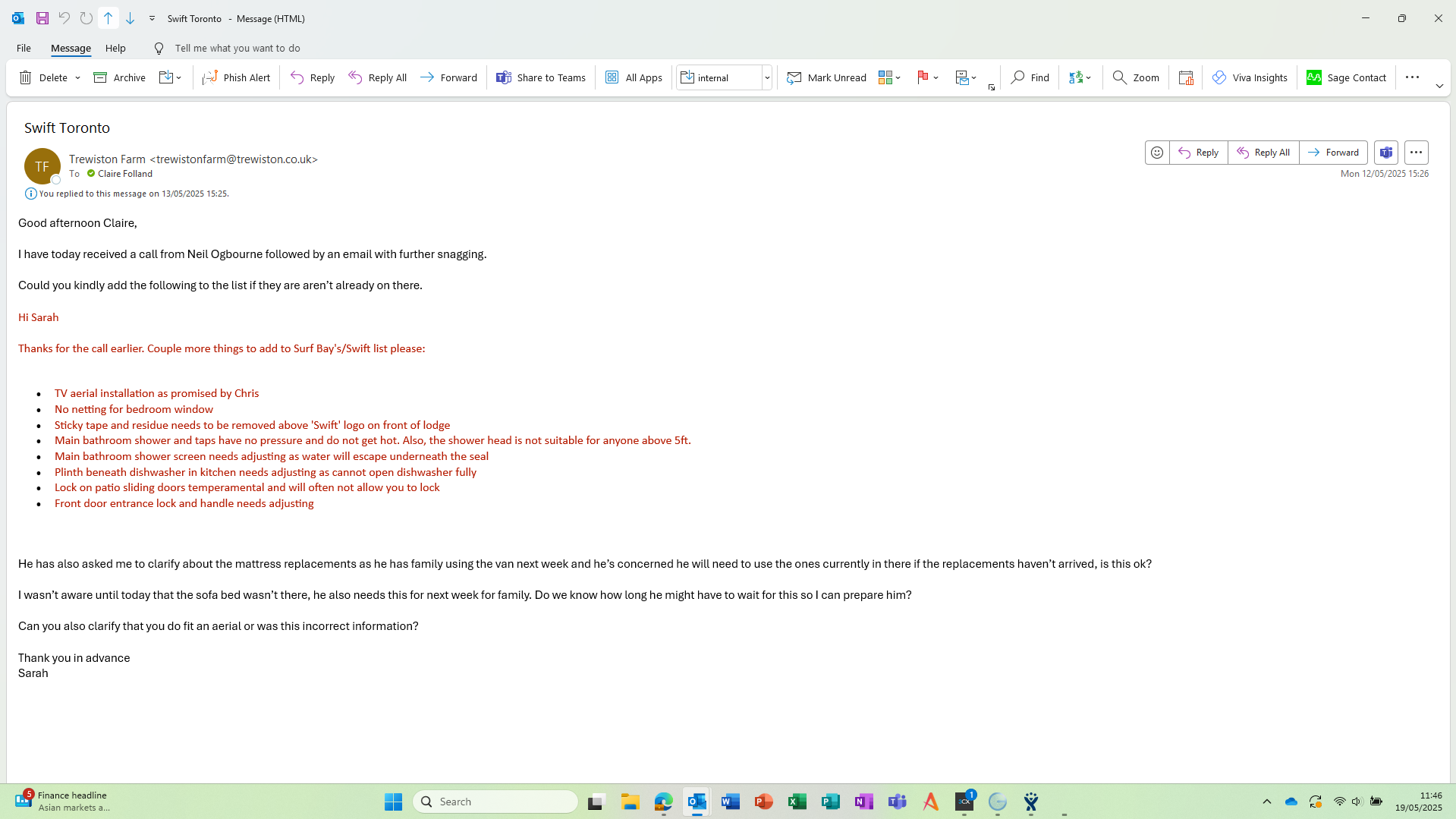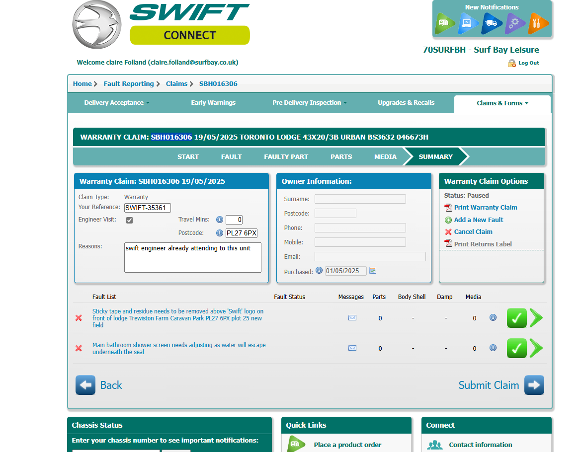| Summary | • Sticky tape and residue needs to be removed above 'Swift' logo on front of lodge | Sticky tape and residue needs to be removed above 'Swift' logo on front of lodge |