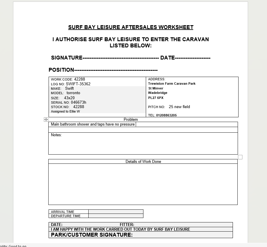 | Summary | CLONE - • Sticky tape and residue needs to be removed above 'Swift' logo on front of lodge | Main bathroom shower and taps have no pressure and do not get hot |