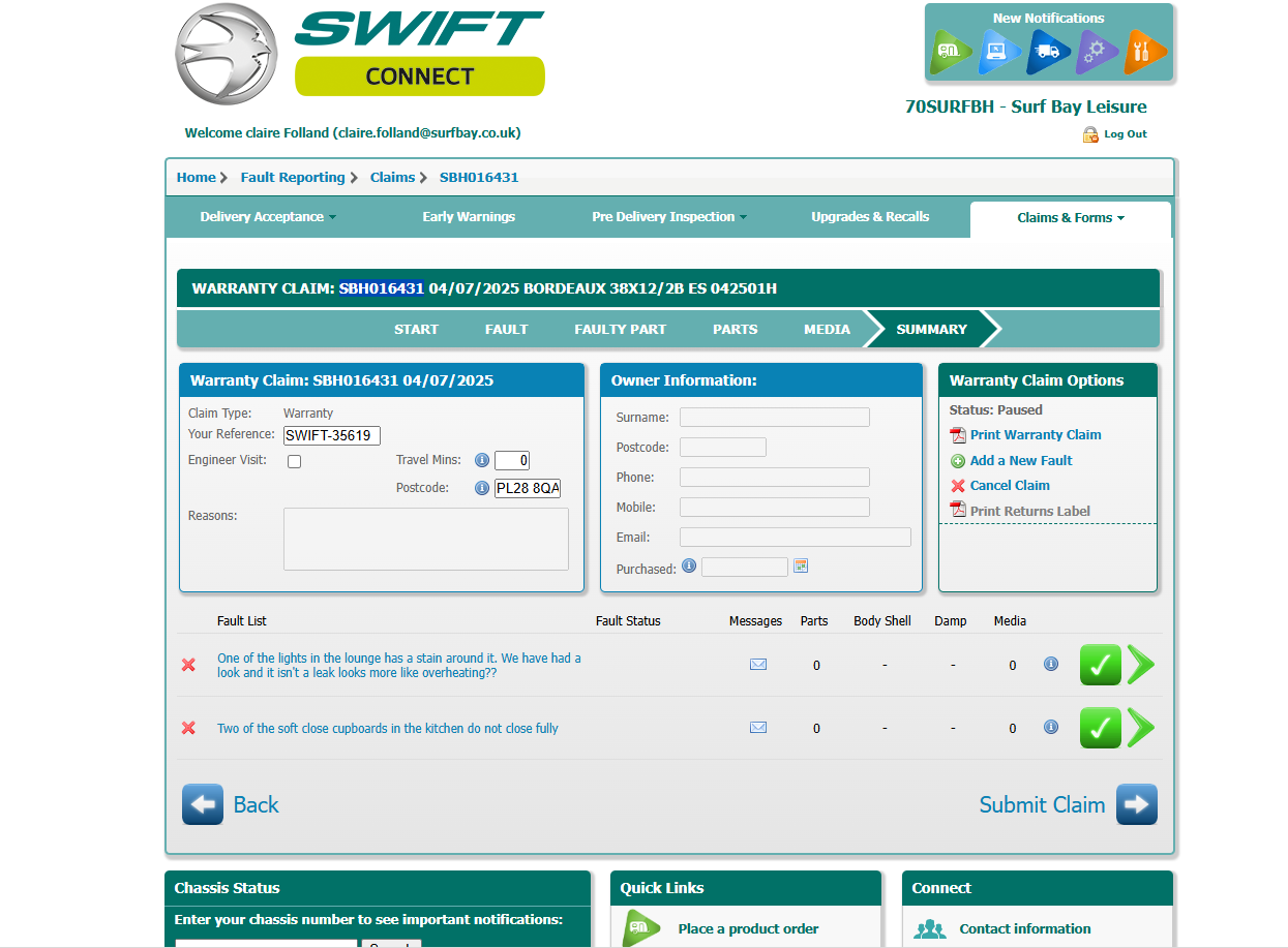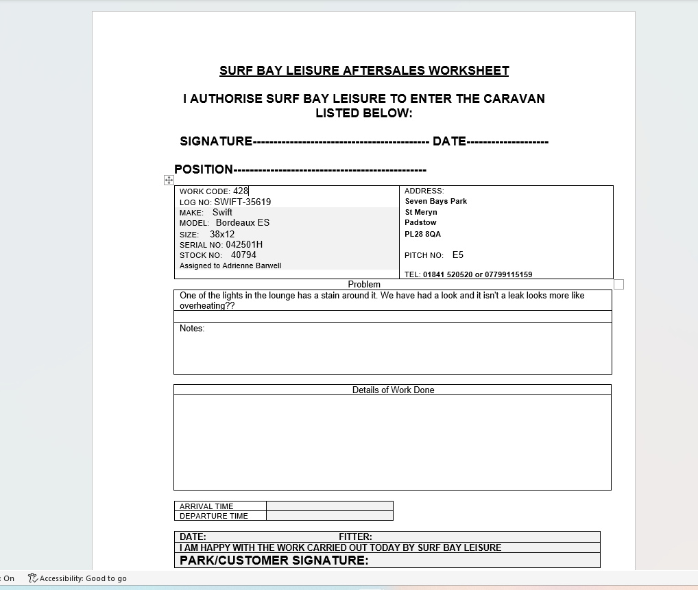 | Summary | CLONE - The arm on the Sofa has collapsed on the inside | One of the lights in the lounge has a stain around it. We have had a look and it isn't a leak looks more like overheating?? |