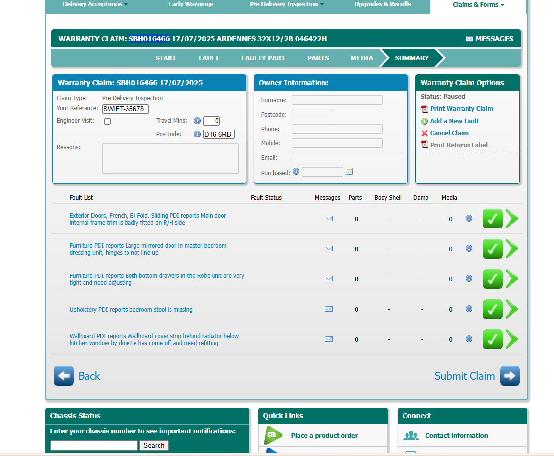 | Summary | CLONE - PDI reports Both bottom drawers in the Robe unit are very tight and need adjusting | PDI reports Large mirrored door in master bedroom dressing unit, hinges to not line up |