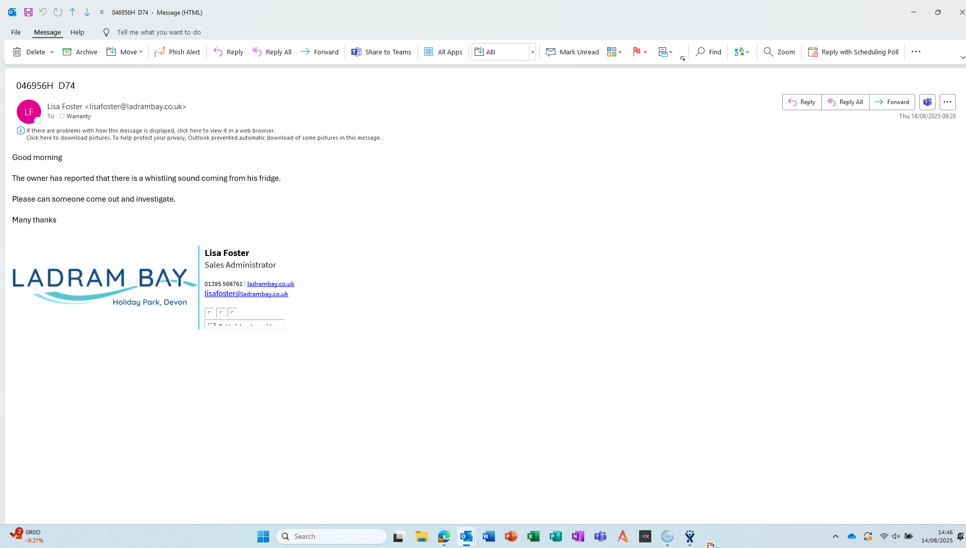 I had a phone call, but we could not proceed as the owners need to be onsite to switch on their fridge. Awaiting a response as to when they are next here and I will contact Warranty Solutions.