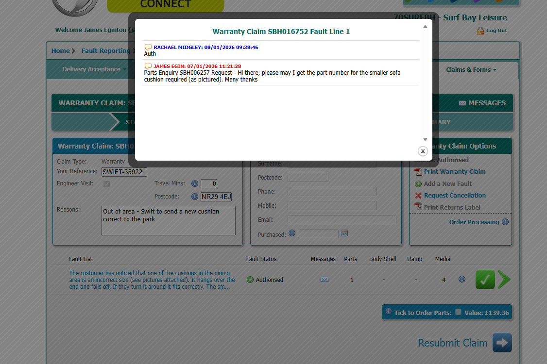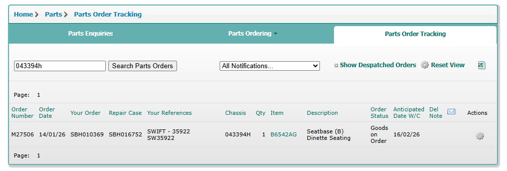 Parts ordered