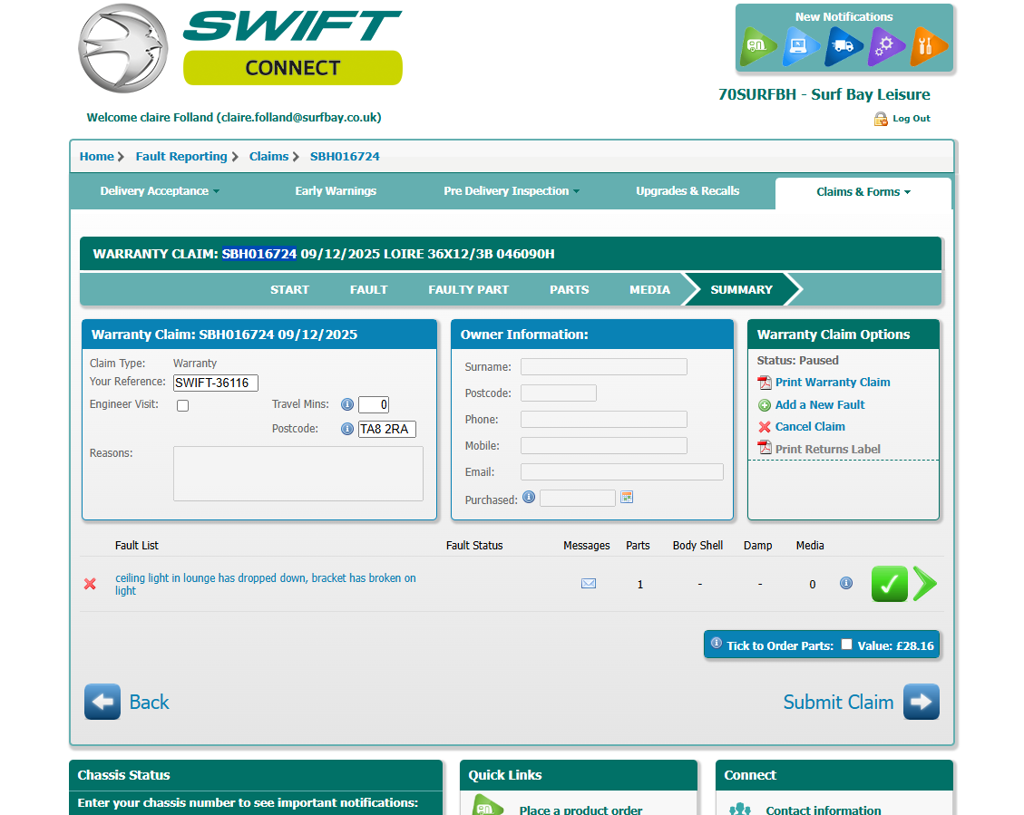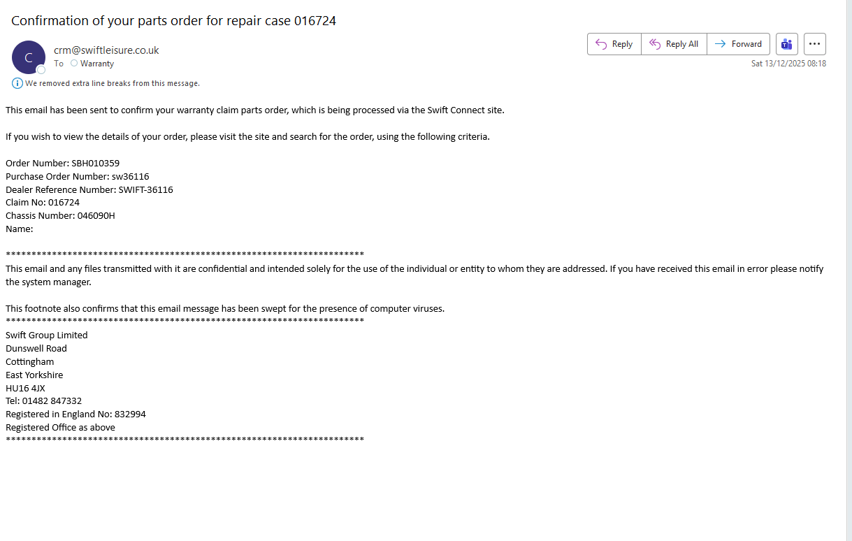 James Eginton added a comment - Parts confirmed as on order by Swift.