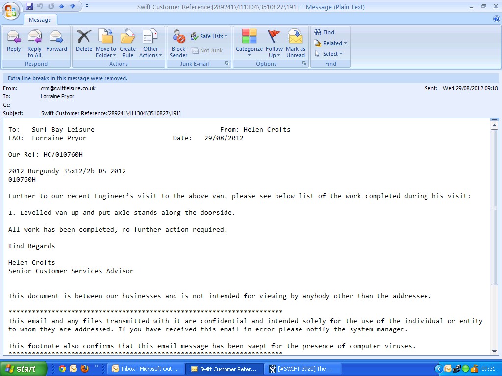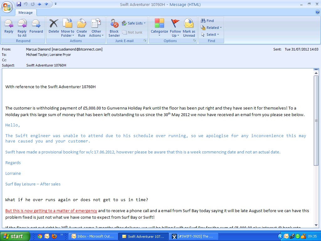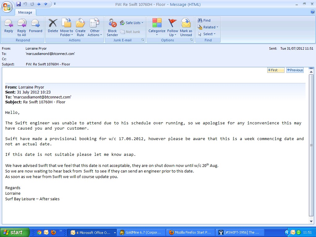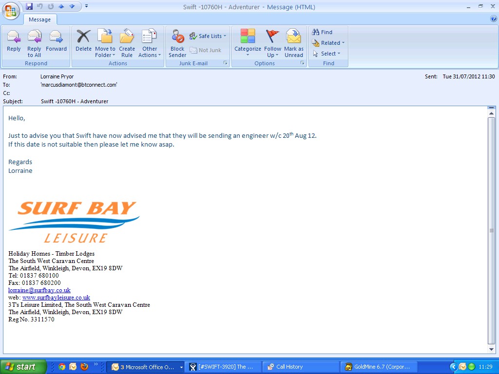 Swift have requested photographs - left a message for Steve on his mobile asking him to send through photographs